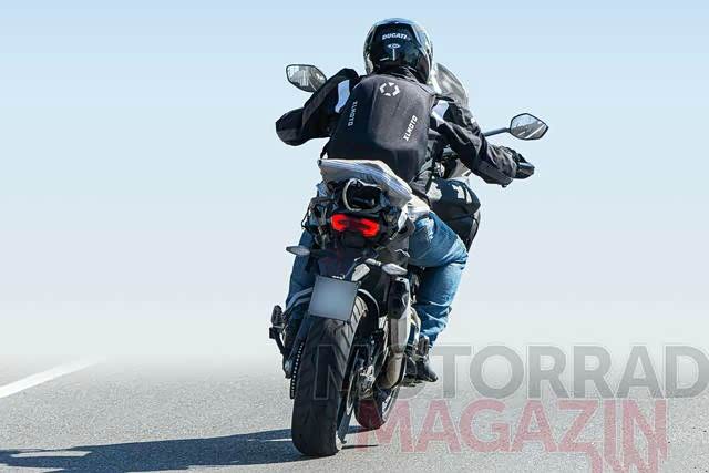 从曝光的谍照中看,新车只是没有车身贴花,整体并没有做任何伪装,由此推测已经非常接近量产版状态。相比现售款MTS 1260外观有了些许变化,主要集中在车头、车尾、摇臂上,大灯增加LED日行灯眉,重新设计了鸟嘴,转向灯集成在油箱护板的两侧。此外后摇臂结构也是MTS V4比较大的变化,由单摇臂变成了双摇臂(刹车盘被安装在右侧),或许是为了匹配更强大的马力、更高强度的穿越能力而所作出的牺牲。