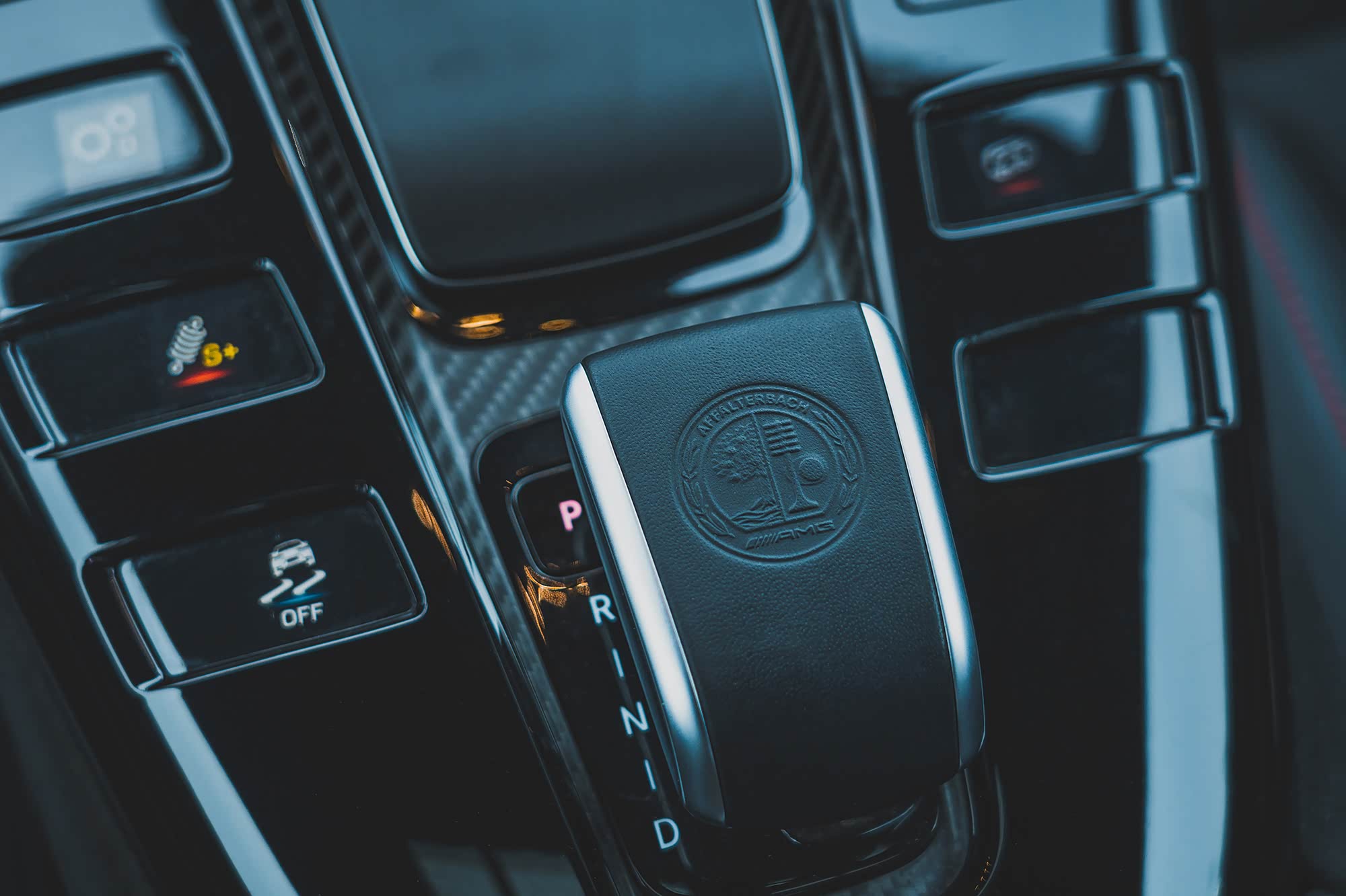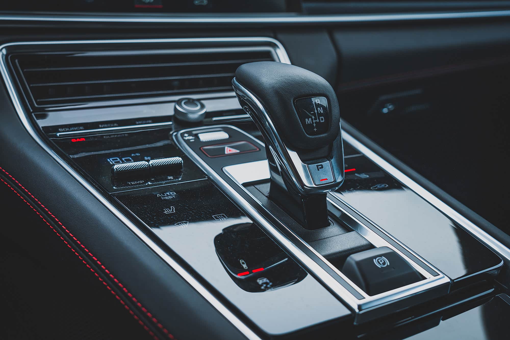 其一是方向盘下部左右各有一个操控装置,左边的按键可以快速切换运动排气、电子稳定系统、悬架软硬等设置,而右边的则是驾驶模式快速选择旋钮,把更多的运动相关控制放在方向盘上是现在高性能车和跑车的发展趋势;其二是挡杆左右的设计,左右各四个按钮的布局构成了一个类似V8发动机的造型,而且这8个按钮上方还各有一个小屏幕,可以显示当前状态,这是个不错的设计。