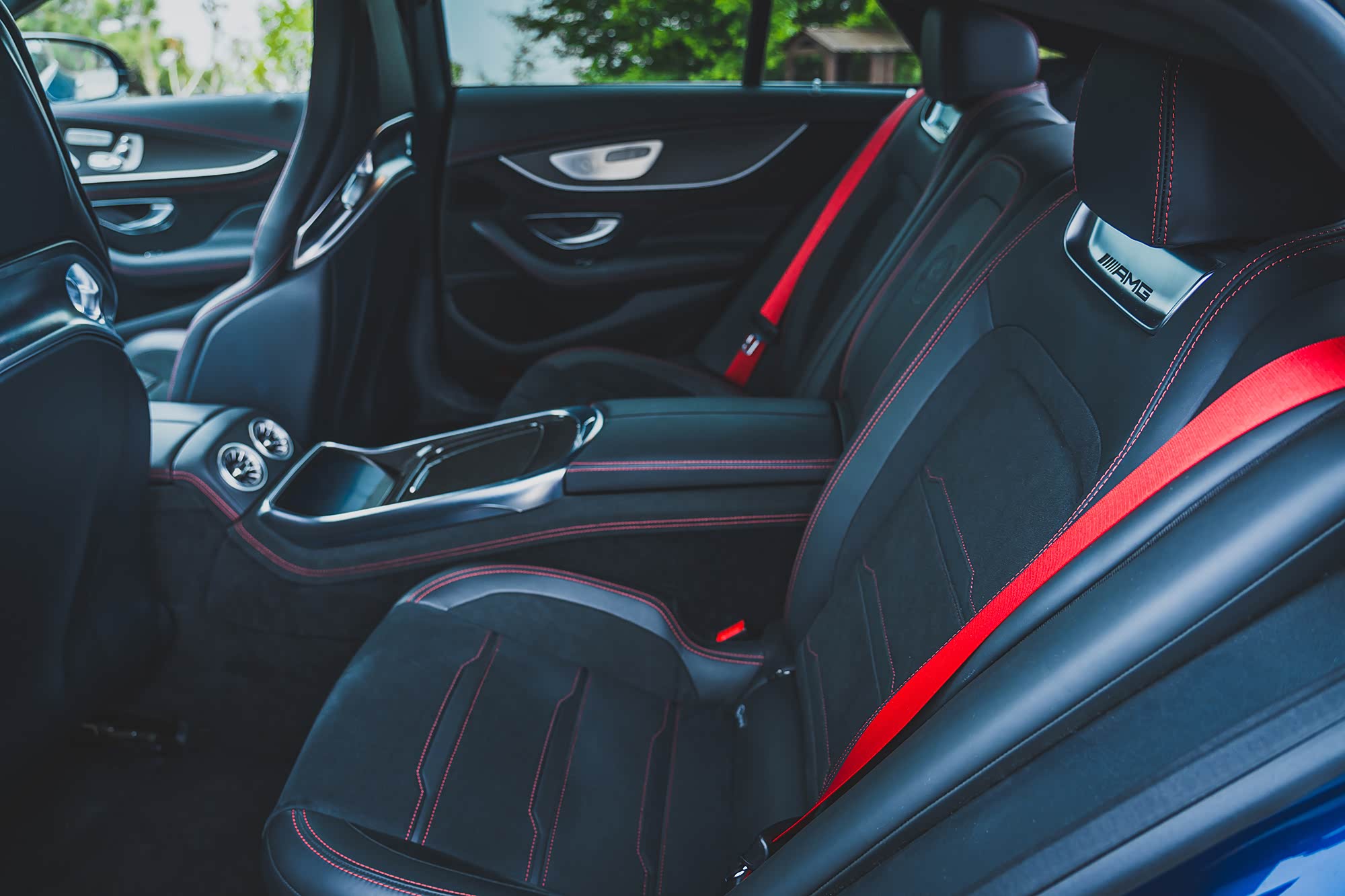 进入车内,梅赛德斯-奔驰的豪华内饰设计展露无疑,无论是双12.3英寸连屏,还是柏林之声音响,又或者到了夜晚那迷人的氛围灯,都让AMG GT 63 S 4MATIC+四门跑车拥有可以跟S级相媲美的豪华感,不过我还是更想说两个跟AMG有关的细节设计。