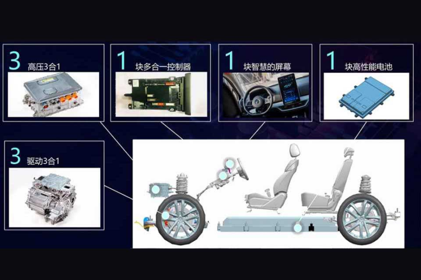 比亚迪e平台分为5个模块,代号为“33111”。这五个数字中,每个都代表了一种模块,第一个“3”代表驱动电机、电控和减速器组成的三合一模块;第二个“3”代表高压充配电系统OBC(车载充电器)、DC(直流变直流转换器)和PDU(配电箱)组成的三合一模块;第三个数字“1”表示各种车身控制器集成在一起的一块PCB板;第四个数字“1”表示一块搭载“DiLink”系统的智能旋转屏幕;最后一个“1”代表一块动力电池模块。