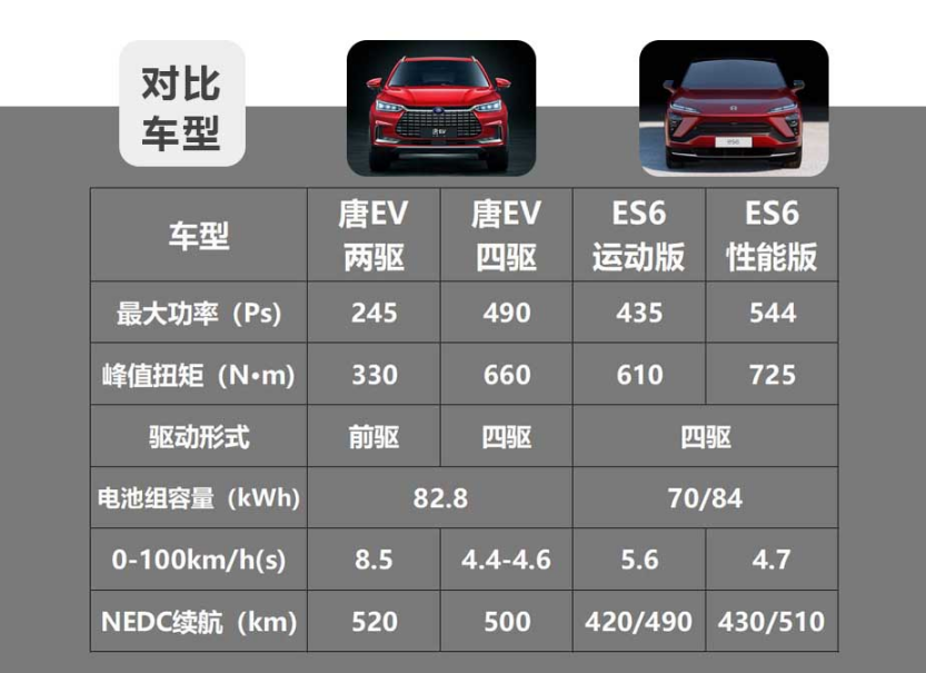 唐EV两驱版车型最大功率245Ps,峰值扭矩330N·m,0-100km/h加速时间为8.5秒,工信部综合续航520km;唐EV四驱版车型最大功率490Ps,峰值扭矩660N·m,0-100km/h加速时间为4.4/4.6秒,工信部综合续航500km。ES6全系均为四驱,运动版最大功率435Ps,峰值扭矩610N·m,0-100km/h加速时间为5.6秒,工信部综合续航420/490km;性能版最大功率544Ps,峰值扭矩725N·m,0-100km/h加速时间为4.7秒,工信部综合续航430/510km。