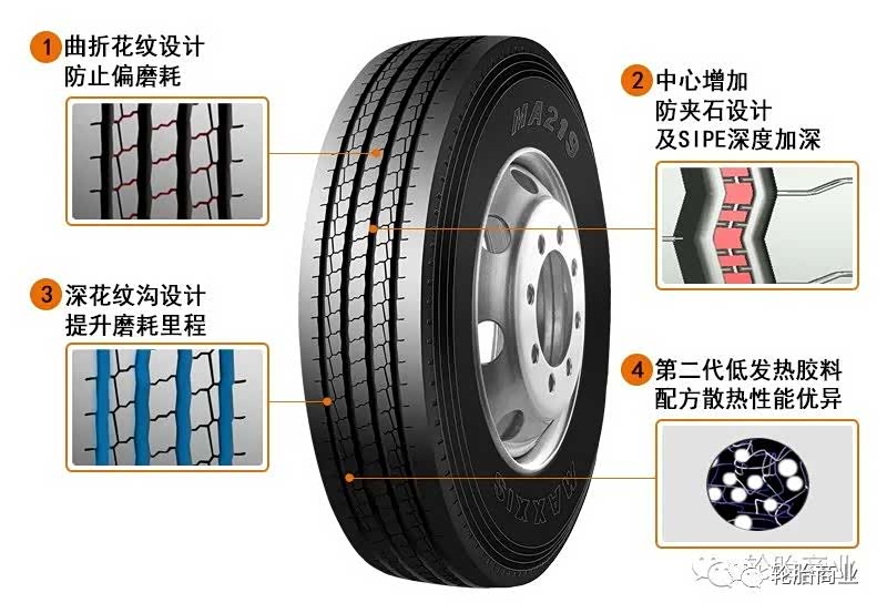 玛吉斯定载MA219全轮位系列产品,在载重120%状况下,MA219接地压力分布均匀且接地形状更佳,有利于正常磨损,不易发生异常磨耗现象,突显高速定载产品特性;胎体中心增加防夹石设计及SIPE深度加深,有效降低夹石率,提升磨后感观及综合性能;MA219采用深沟花纹设计,沟深达到17.3mm,为磨耗里程提供保障;第二代低发热胶料配方、散热性能优异;MA219采用第二代低发热胶料配方,在定速行驶条件下,胎体温度始终比以往品低4~8℃,且散热性能优异,尤其适合长途高速定载市场。