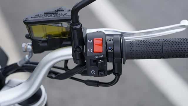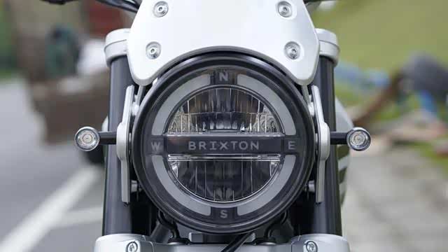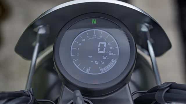 ▲复古圆形LED车头灯,远近光分上下排列,车灯外圈设计了日行灯带。数显仪表盘同为圆形设计,只是尺寸偏小,强光下信息读取不是特别清晰。