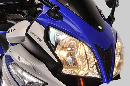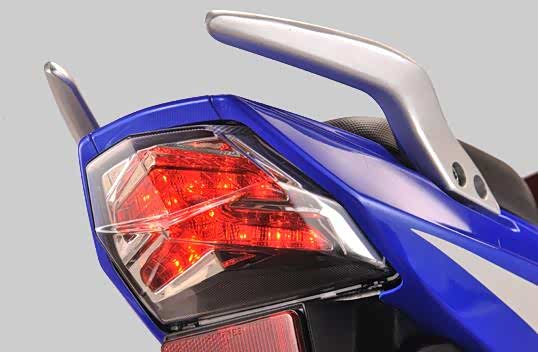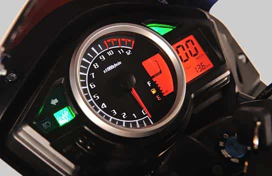 作为一款入门级的跑车,隆鑫GP200R还是非常注重自己的颜值表现的。整车设计非常流畅,车身比例协调,装饰得很有街头感。车身长宽高尺寸分别为1980*700*1080mm,轴距尺寸为1340mm。前脸采用了卤素双大灯,眼角还有LED位置灯,配合尖锐的头部,看起来特别像猫头鹰的脑袋。下方是LED转向灯和示宽灯,也比较有气质。仪表盘采用了机械指针与液晶屏幕组合式仪表,可以清楚地看到车速、里程、转速、档位等信息。
