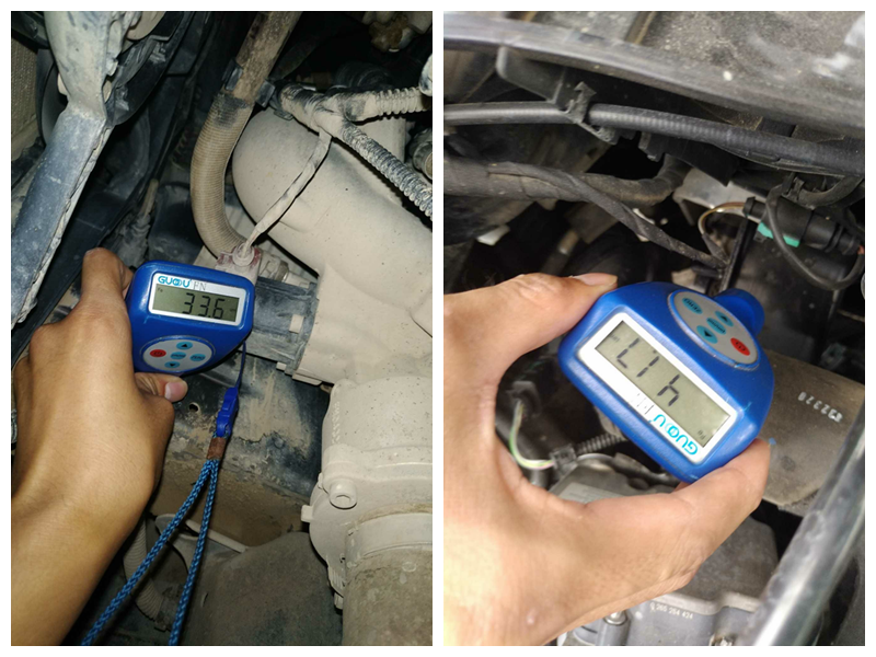 左右两前纵梁漆面厚度正常,表面平顺自然,无切割变形钣金修复痕迹,车辆主要结构件无受损修复,基本排除了前部严重事故的嫌疑。