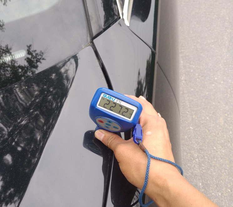 机盖左侧边缘有过钣金修复,图中的数值表示的是漆面厚度,一般奥迪车的正常漆面数值在120um到150um之间,而这里的漆面厚度已经两千多,要知道漆面厚度最高是3000um,这已经接近爆表了,无疑是钣金修复后补漆了,也就是说车头左前这里有过磕碰损伤。
