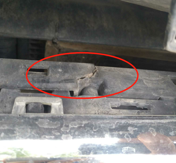 前部水箱的上盖板断裂了,这是被撞的吗?看了看机盖鼻锁和里层的水箱框架、风扇,没有撞击修复的情况。那么盖板断裂就可以暂时忽略了,小问题。
