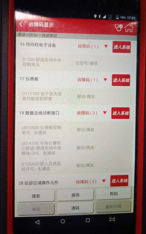 前面我们检测到车辆内部涉水,而现在的车子用电设备比较多,并且大多都是集成的电子模块,这就需要用到我们的解码器对电控系统进行检测。一番操作后,果然不负众望,大量的故障码出现,看来内部涉水还是影响到车辆的电控系统。