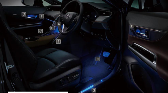为了提升车内的品质感,氛围灯的加入必不可少。全新Harrier的车内一共配备了8处氛围照明,并可调节亮度以及颜色。