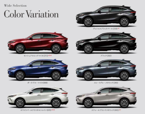 全新Harrier在车身颜色上提供了7种不同的选择,且每一种漆面都提供了带有云母的珍珠漆,在阳光下呈现出更加丰富的色彩效果。另外在轮圈上也有三种不同的选择。其中一款是19英寸,配备225/55 R19规格轮胎,第二款是18英寸,配备225/60 R18规格轮胎,第三款是17英寸轮胎,配备225/65 R17规格轮胎。