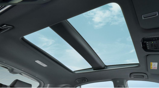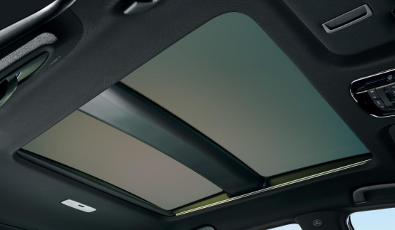 车内配置方面最大的亮点是这块可调光的全景天窗。他的工作效果同变色玻璃同理,在阳光直射时可以将玻璃调整到更深的颜色以阻隔阳光。