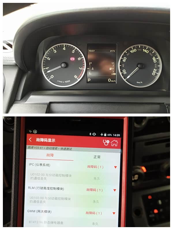 接着启动车辆,车辆自检仪表无故障灯点亮,但是OBD诊断系统有永久故障码存在,与分动箱控制模块通信丢失,需要及时检修处理,不过目前底盘升降并无异常,仪表并未显示悬架故障。后期可以到4S店进行检修。