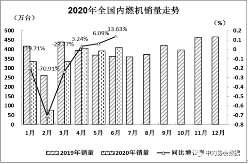 据中国内燃机工业协会《中国内燃机工业销售月报》数据,按可比口径,6月销量410.52万台,环比增长4.88%,同比增长13.63%;1-6月累计销量1 956.14万台,同比增长-12.84%,较上月降幅收窄5个百分点。
