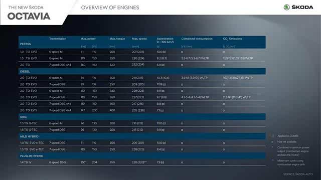 至于动力方面,全新OCTAVIA COMBI在2.0T涡轮增压发动机的基础上,还将提供48V轻混动力系统以及插电式混合动力系统,详细内容参数可参见下表。