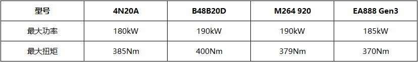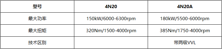 4N20其实是一个系列,毕竟现在流行高、低功率搭配嘛。这样既节约了引擎成本,又不失体面。即便是低功率,至少听起来排量是一样。根据高低功率调校,4N20系列细分为4N20和4N20A。为方便阅读,我们将高低功引擎参数列表显示。