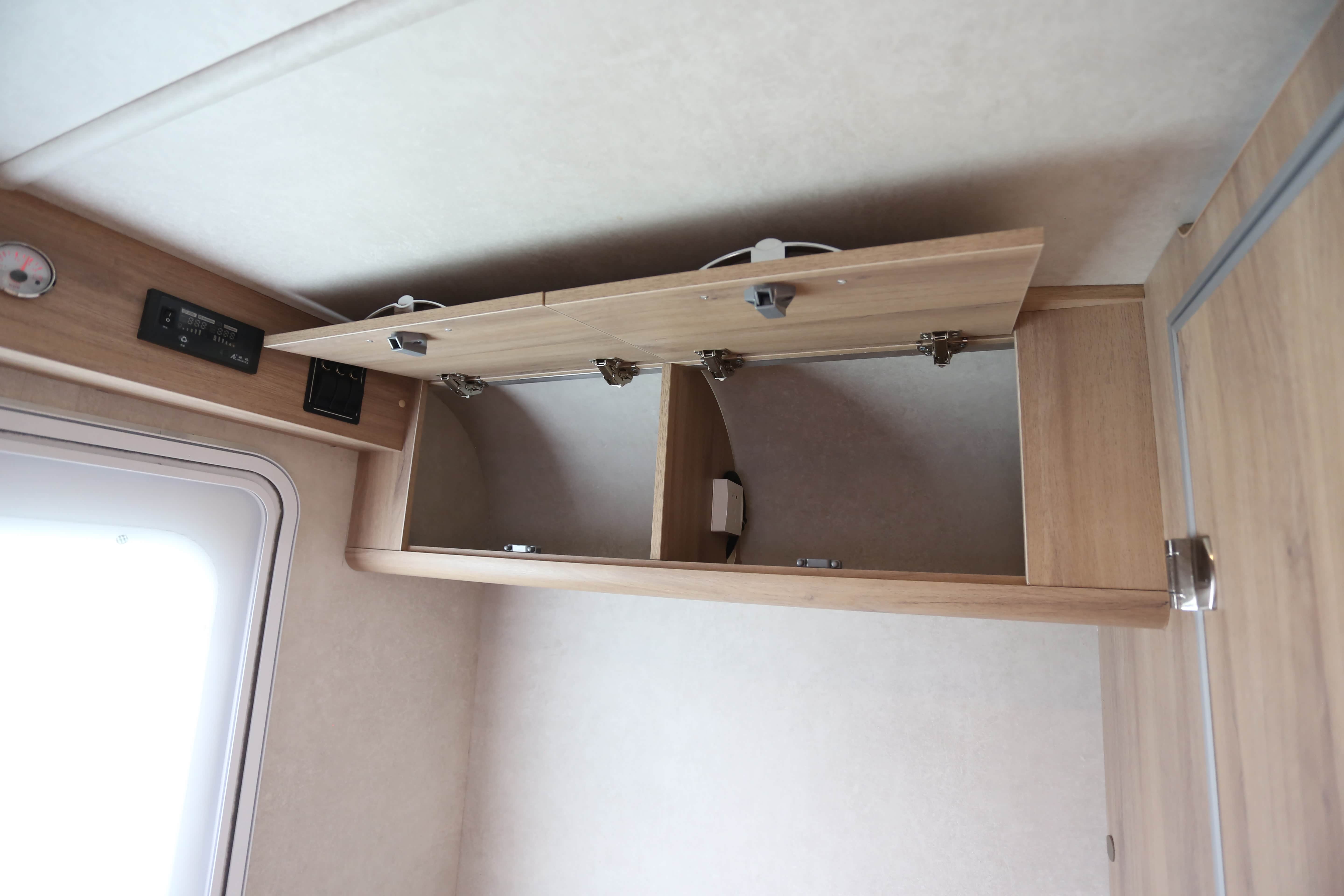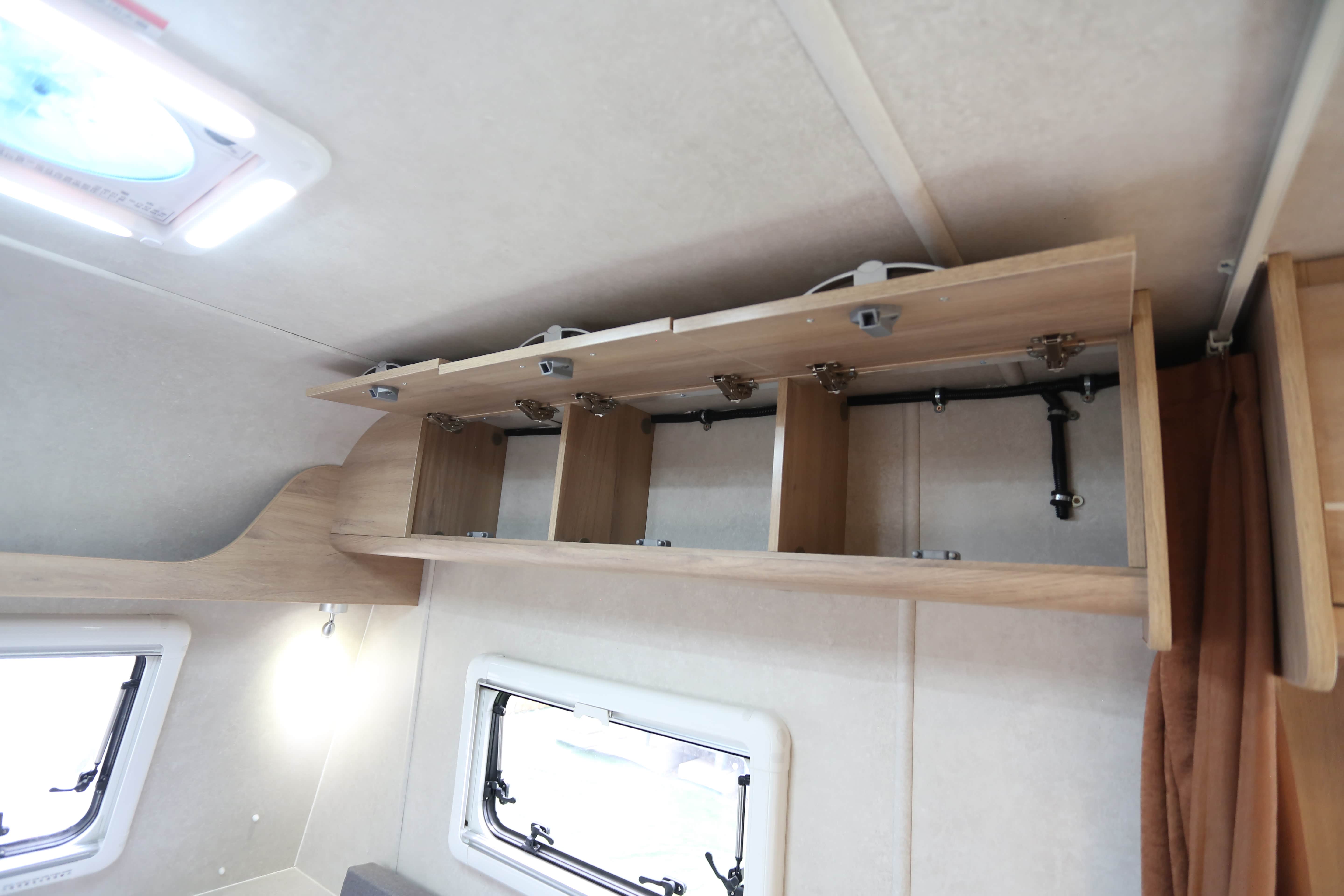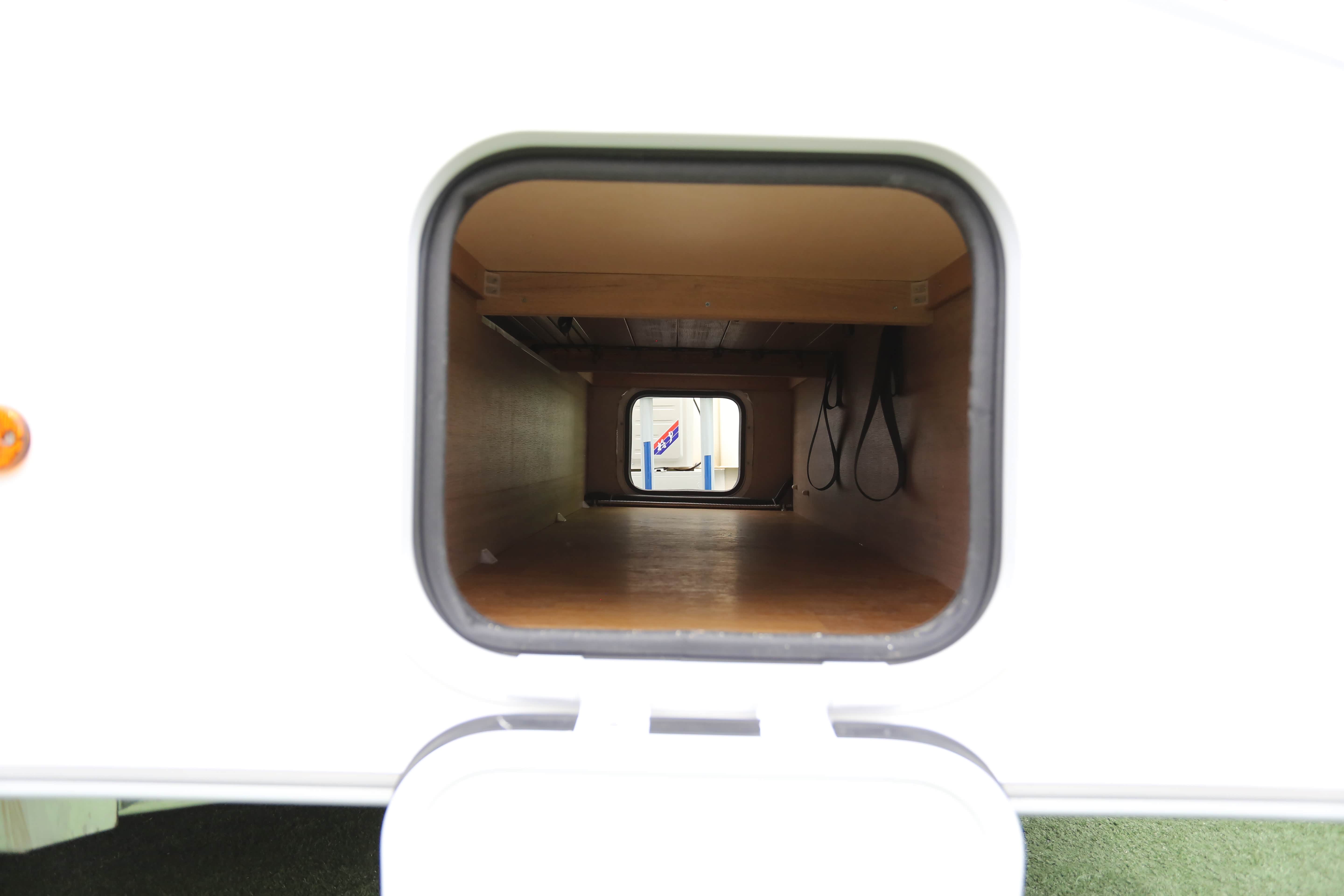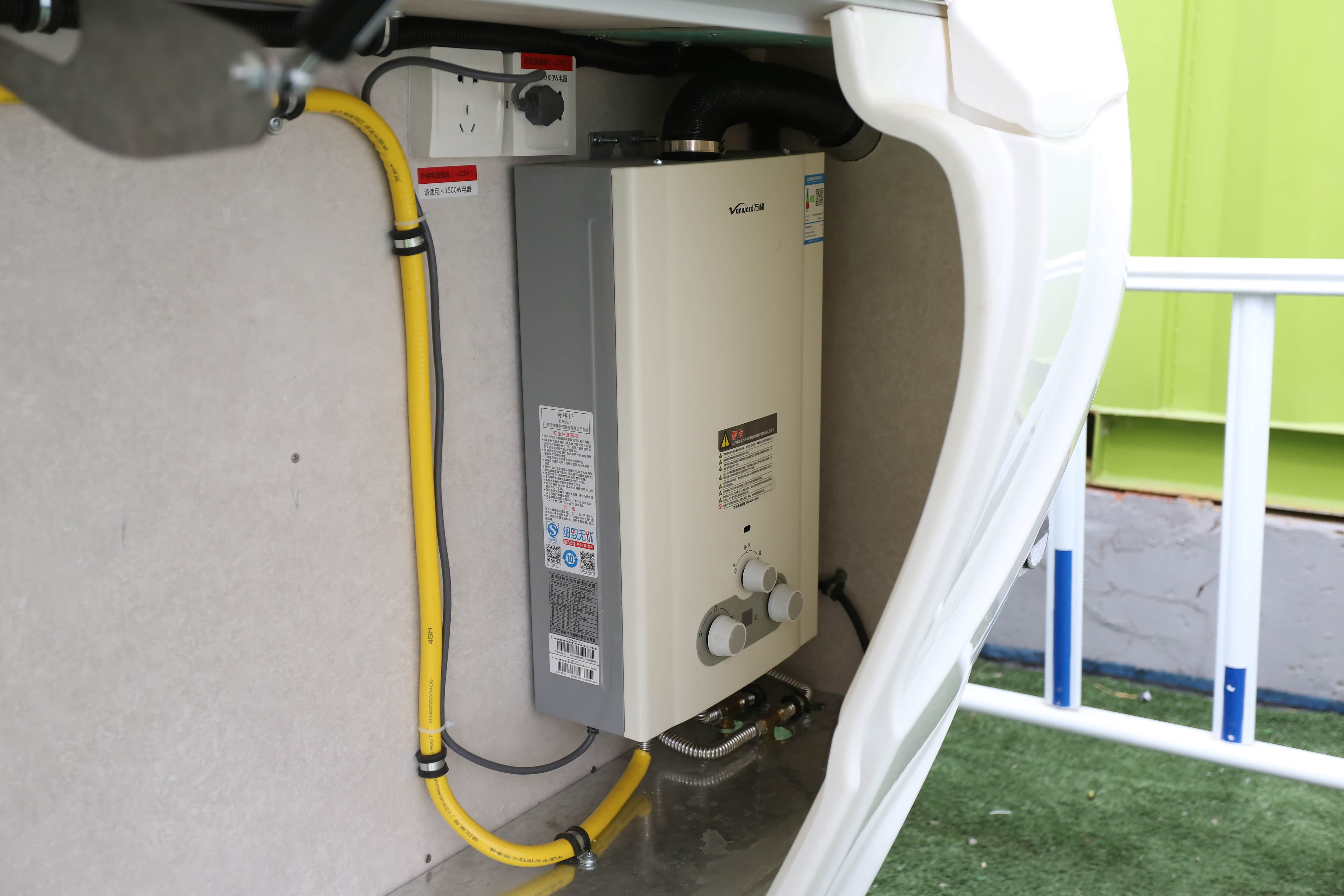 前设备舱右侧配有燃气热水器,插上电就能在房车内洗上热水澡了,左侧配有燃气罐固定绑带,中间还有很大的空间,可以放一些行李物品。