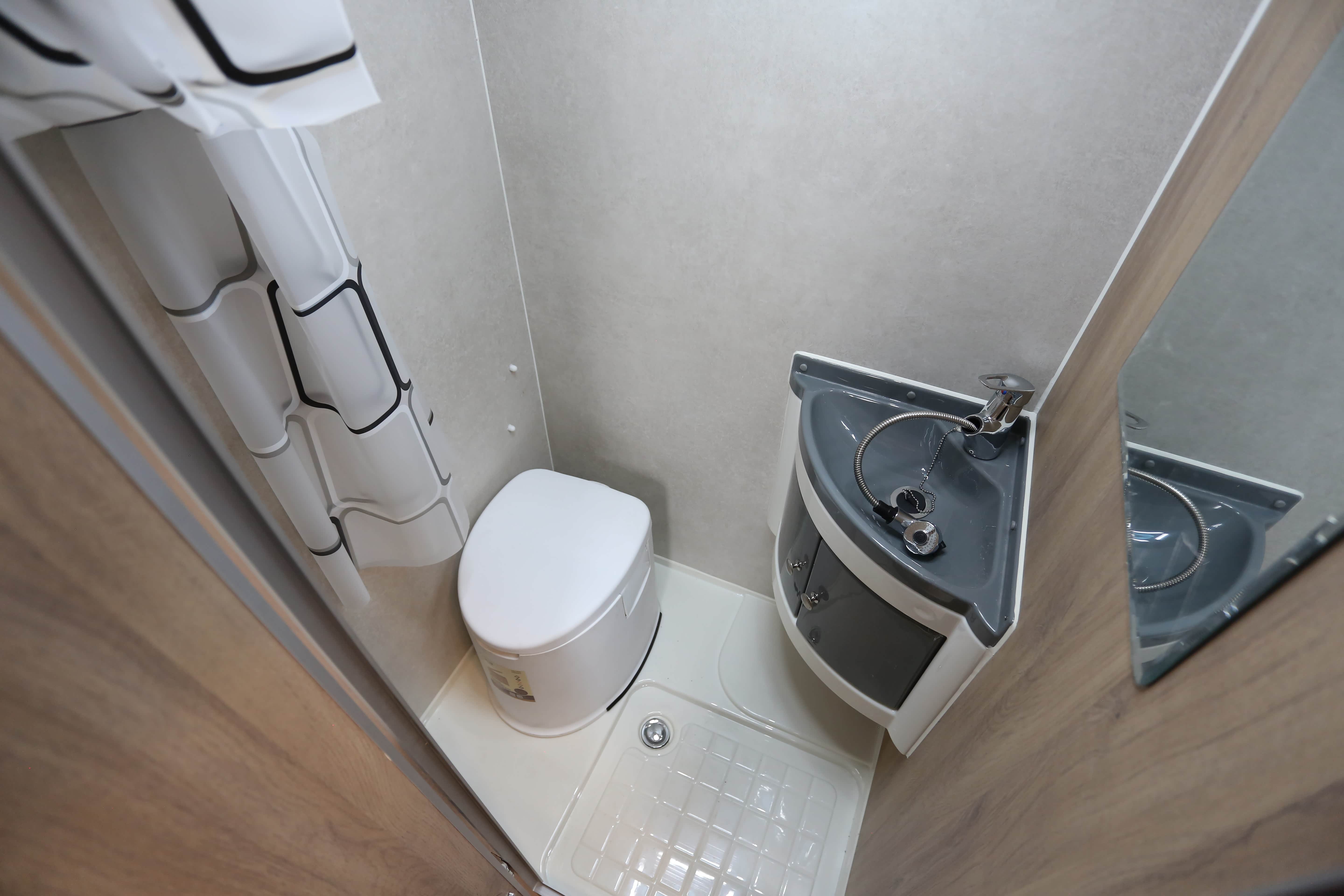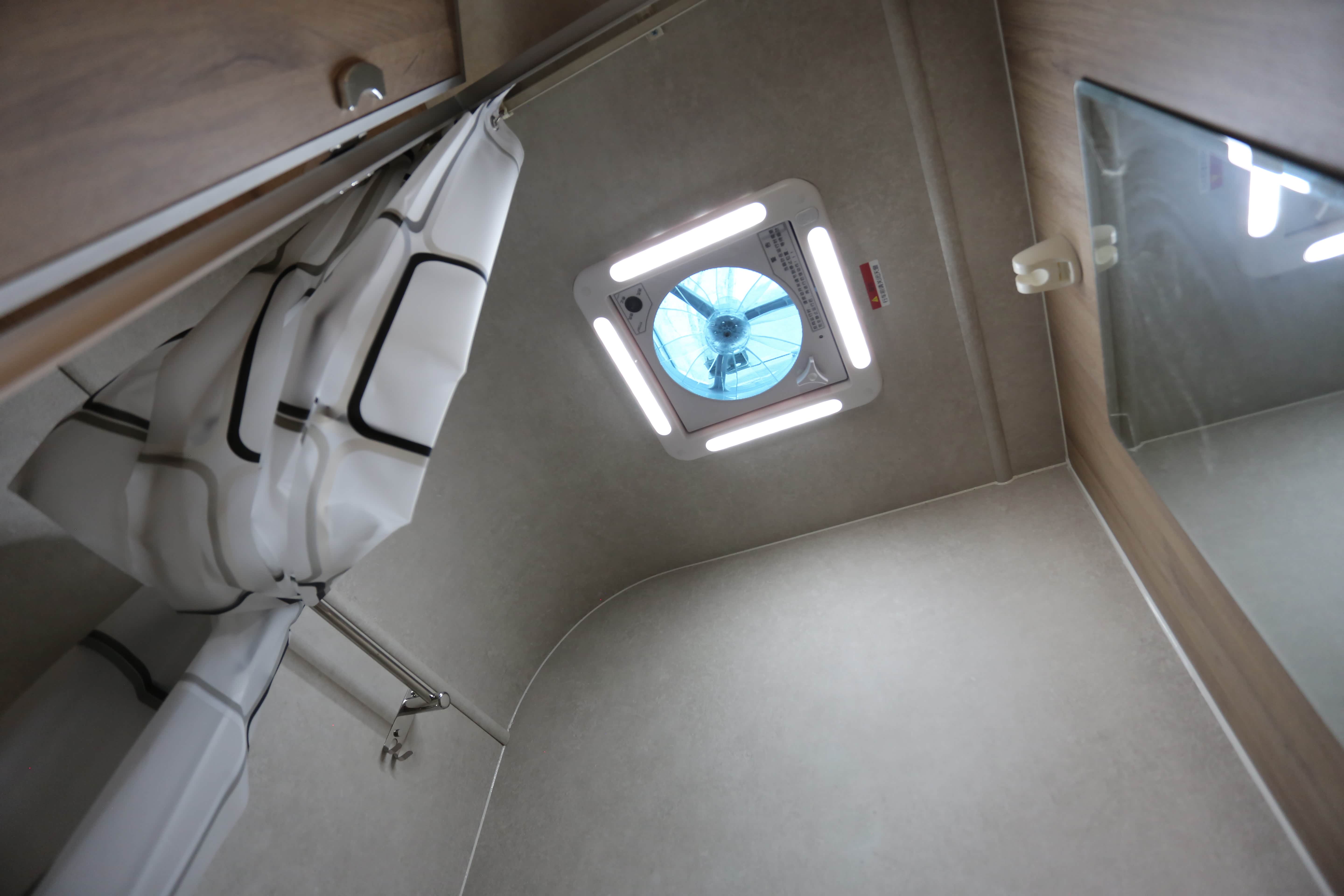 卫生间配有便携式马桶,洗手池,抽拉式淋浴花洒,车顶上方配有双向换气扇,可以保证卫生间空气流通,减少异味。