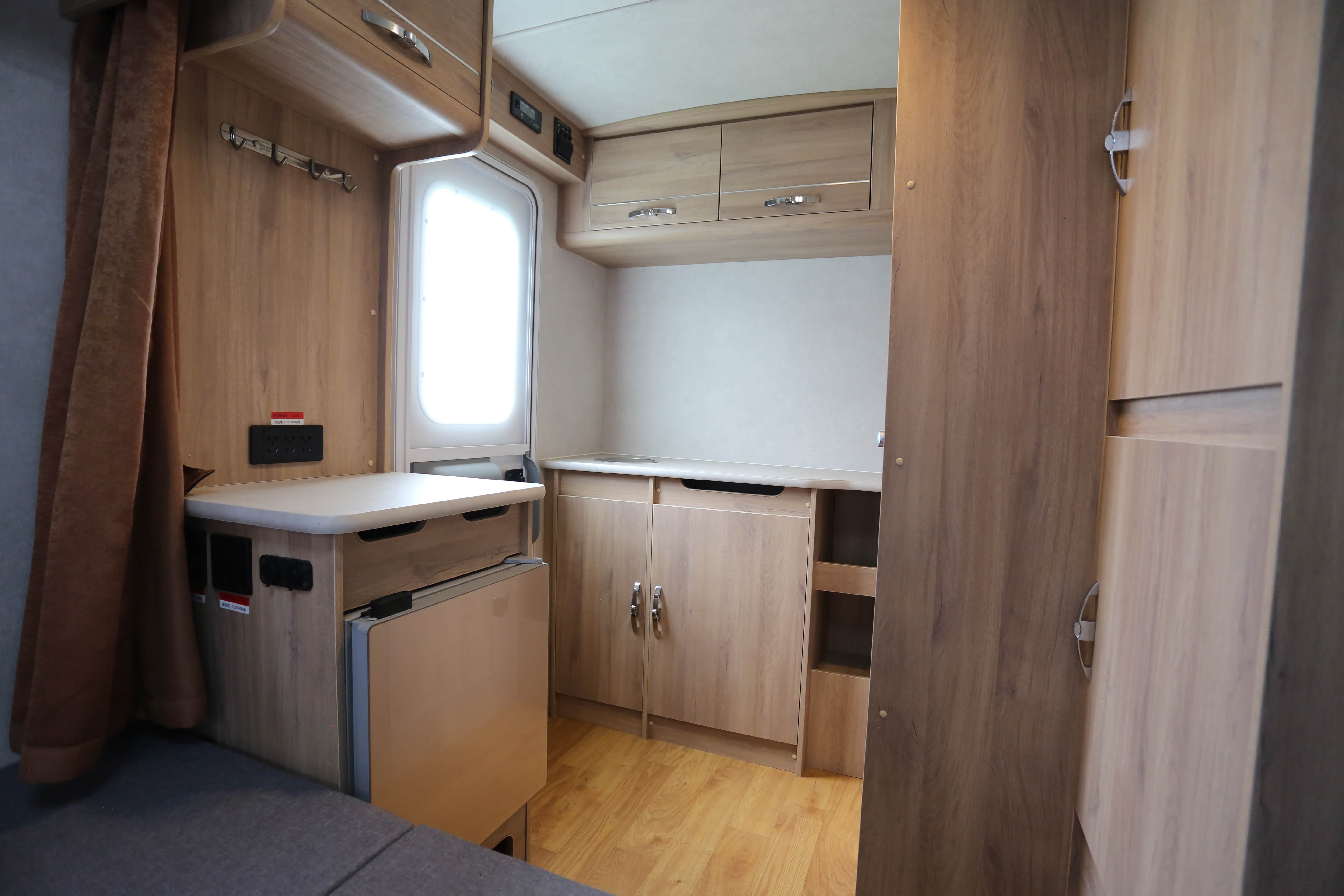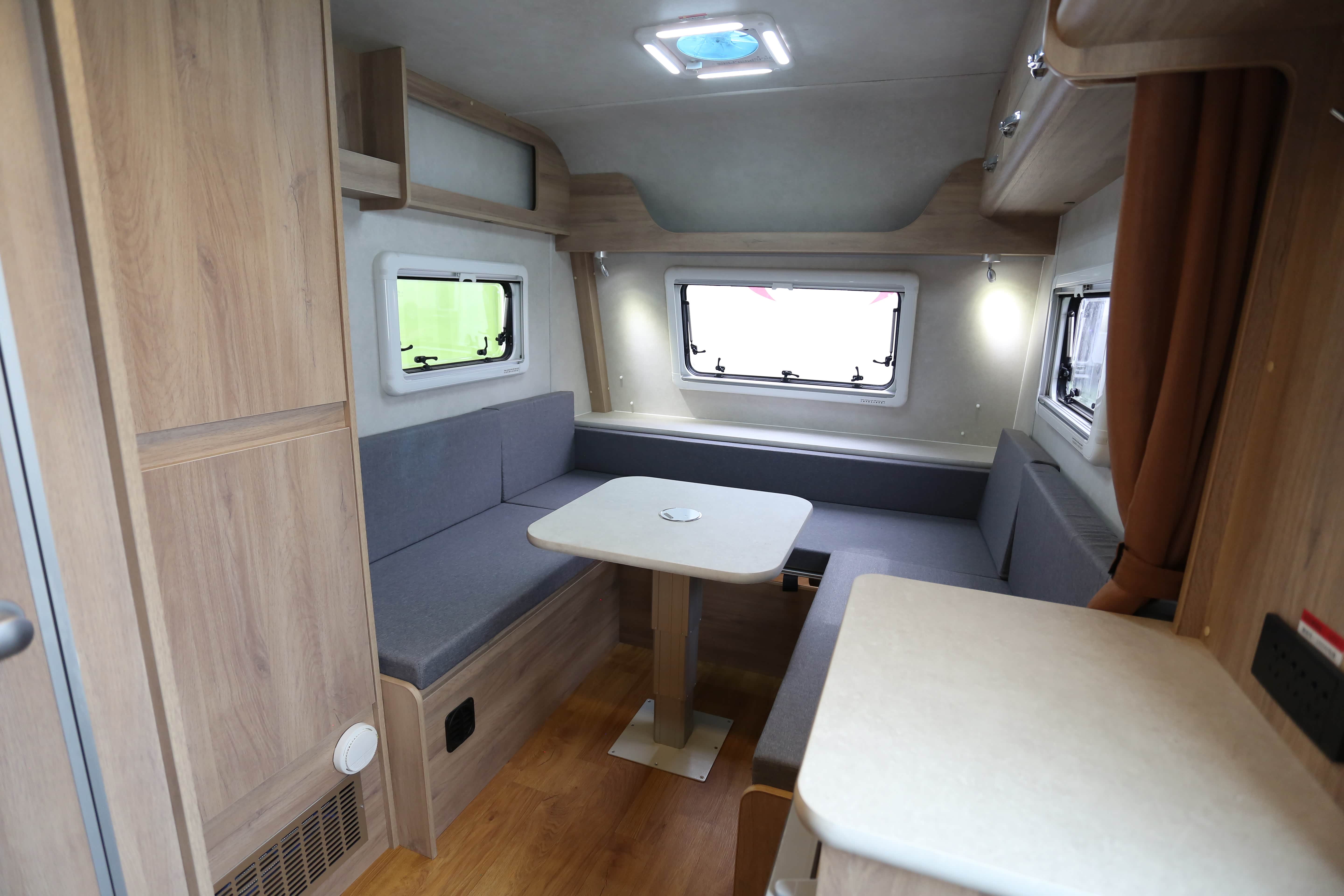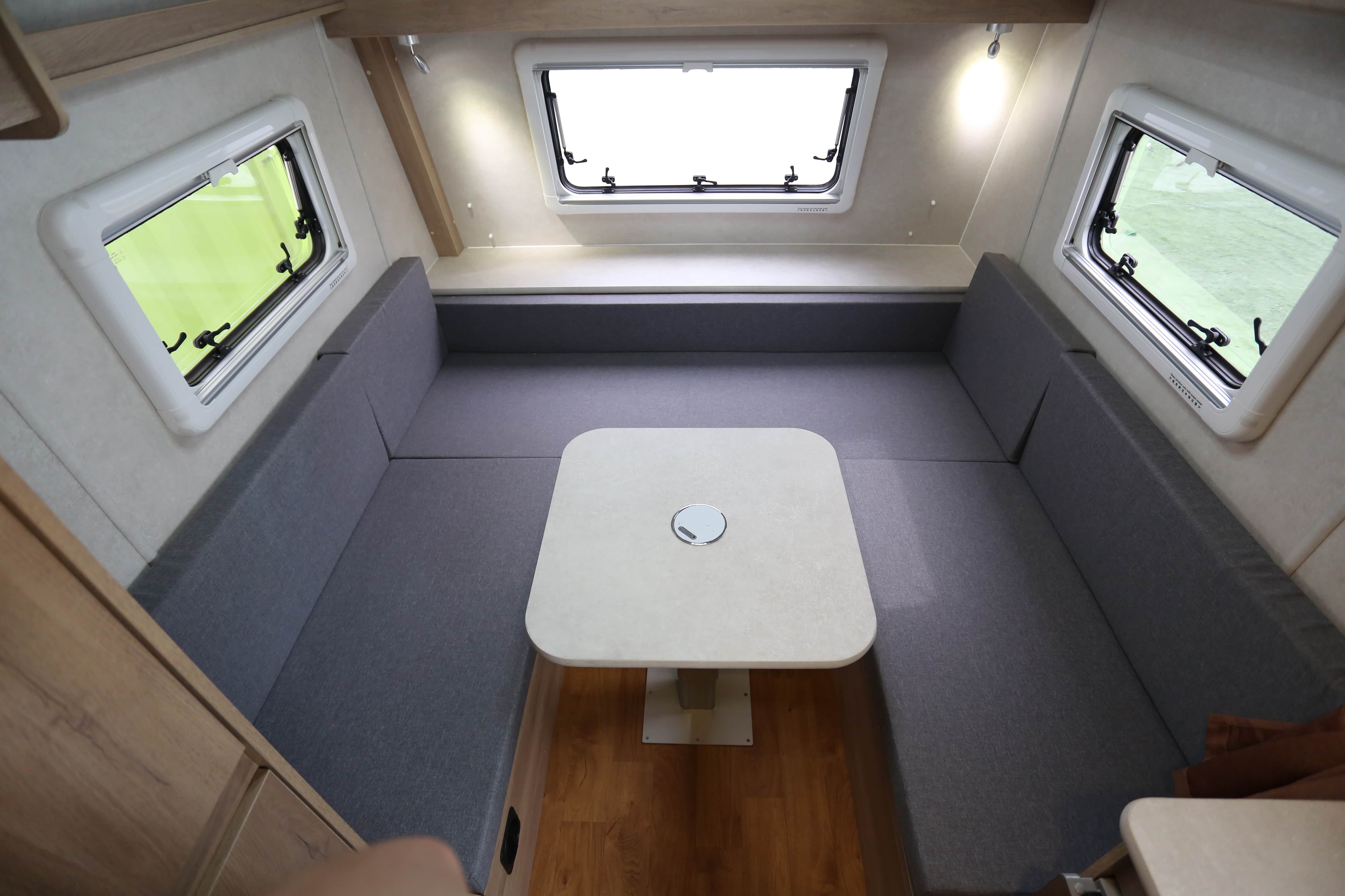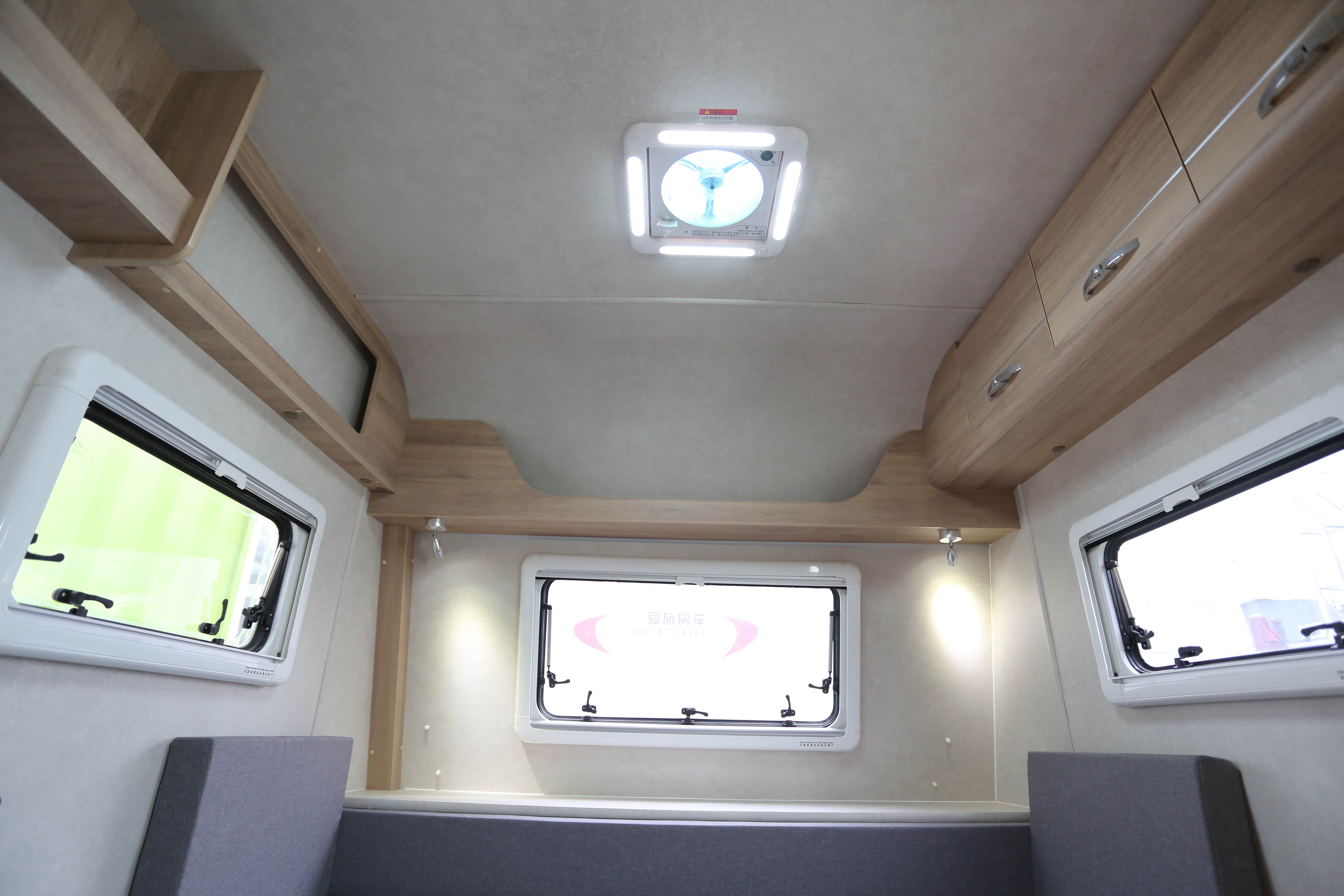 车内的家具配色是浅色系的,而且窗户比较丰富,车内给人的感觉还是很亮堂的,车头是客厅区,车尾是厨房和卫生间。