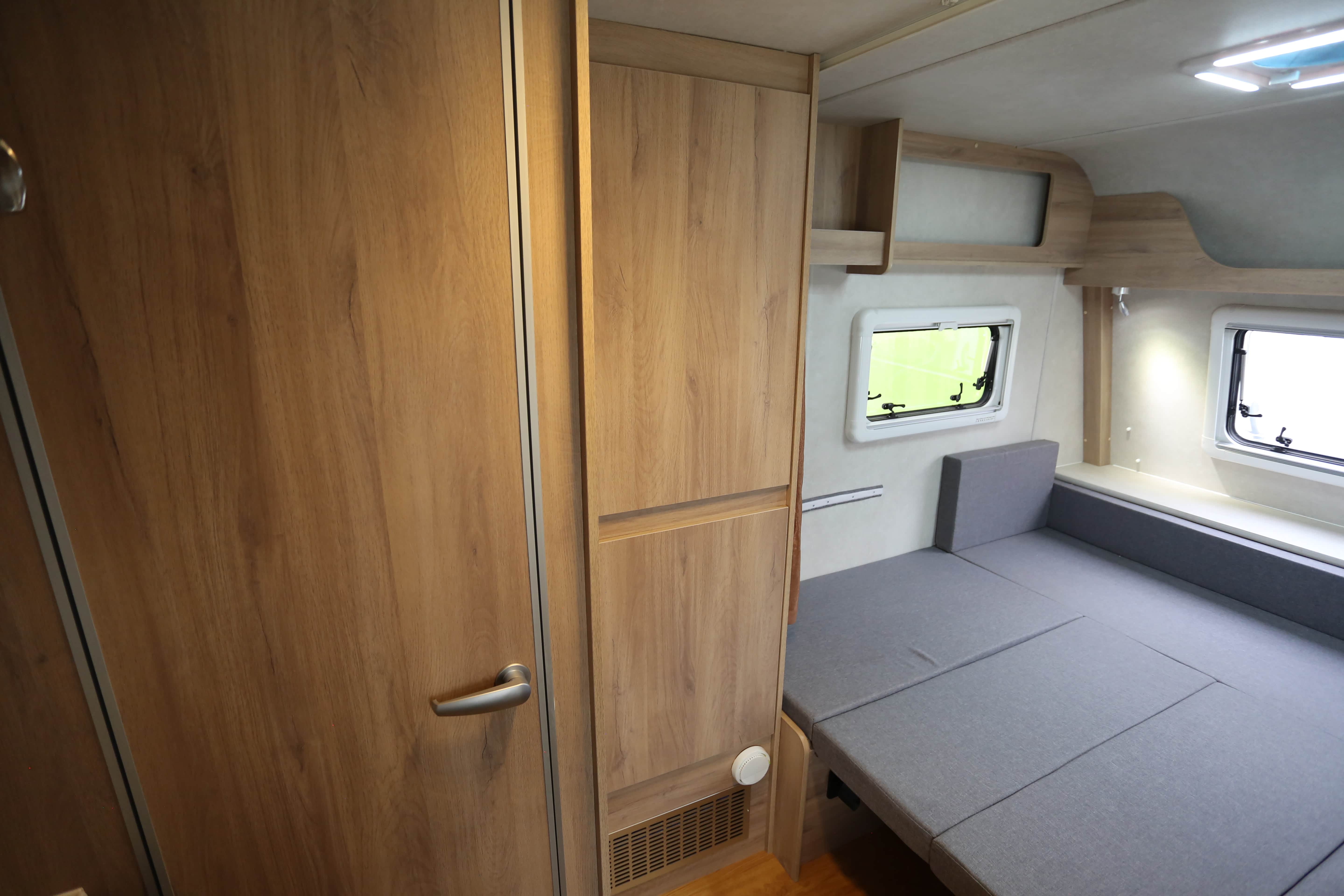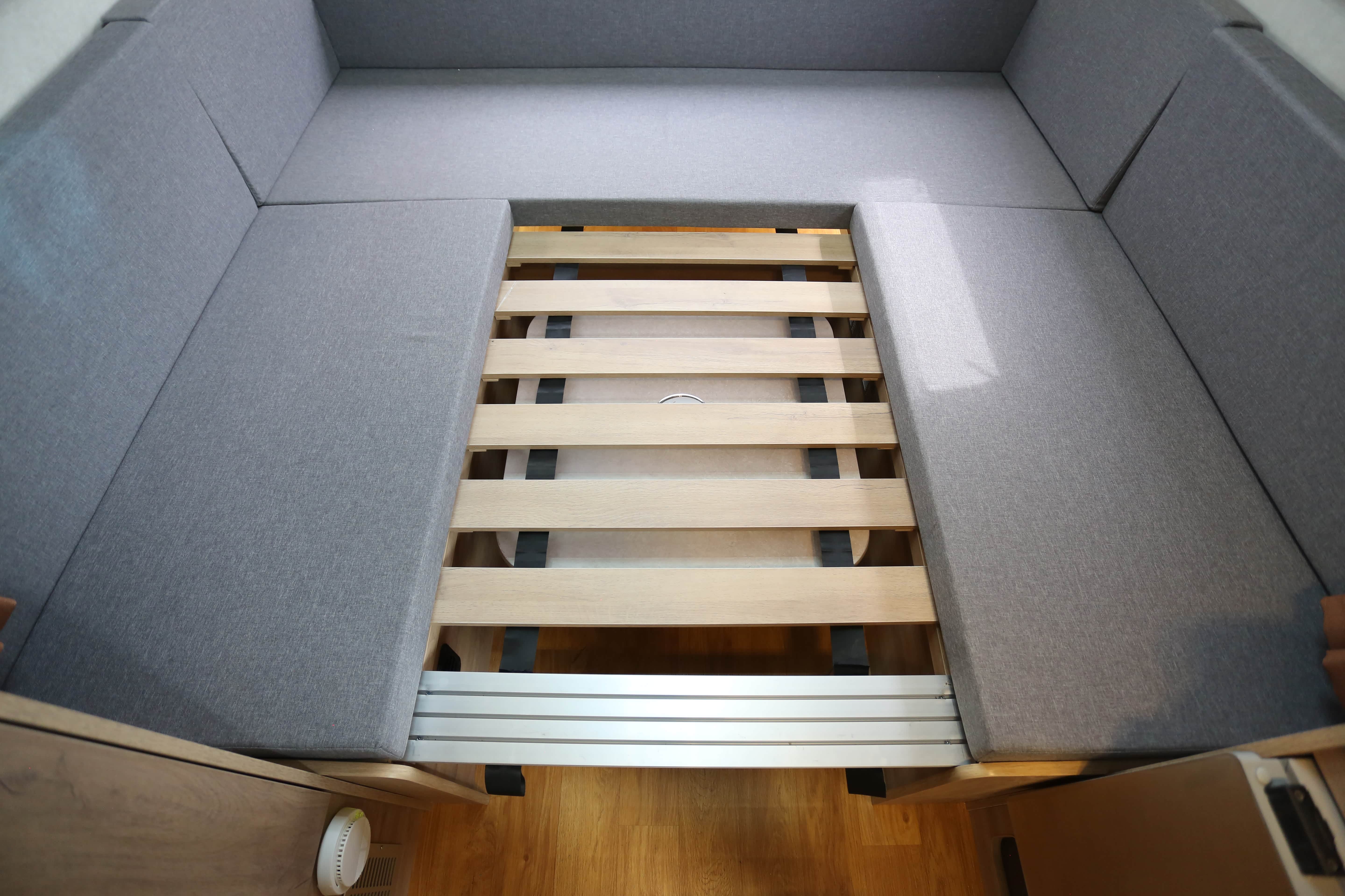 客厅区由U型沙发和升降餐桌组成,沙发采用布艺包裹,质感偏硬,支撑性很好。当然房车上没有床是不可能的,沙发在晚上就可以通过简易的调整来变成一张床,这个尺寸睡两个成年人是不成问题的。