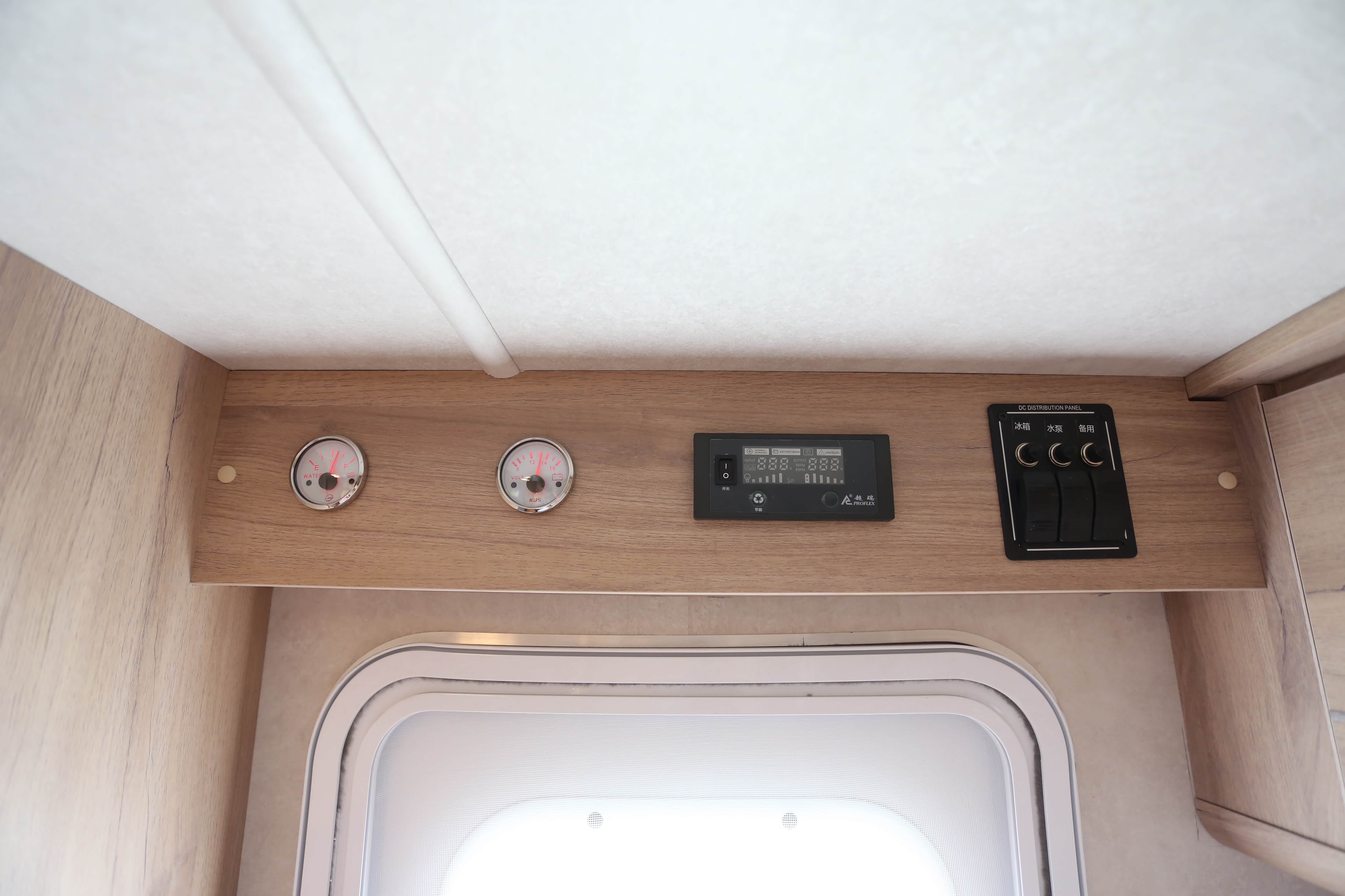 车门上方是这辆拖挂房车的控制面板区,可以查看水位,控制水电。该车净水箱90升,配有1500W逆变器,100Ah胶体蓄电池。