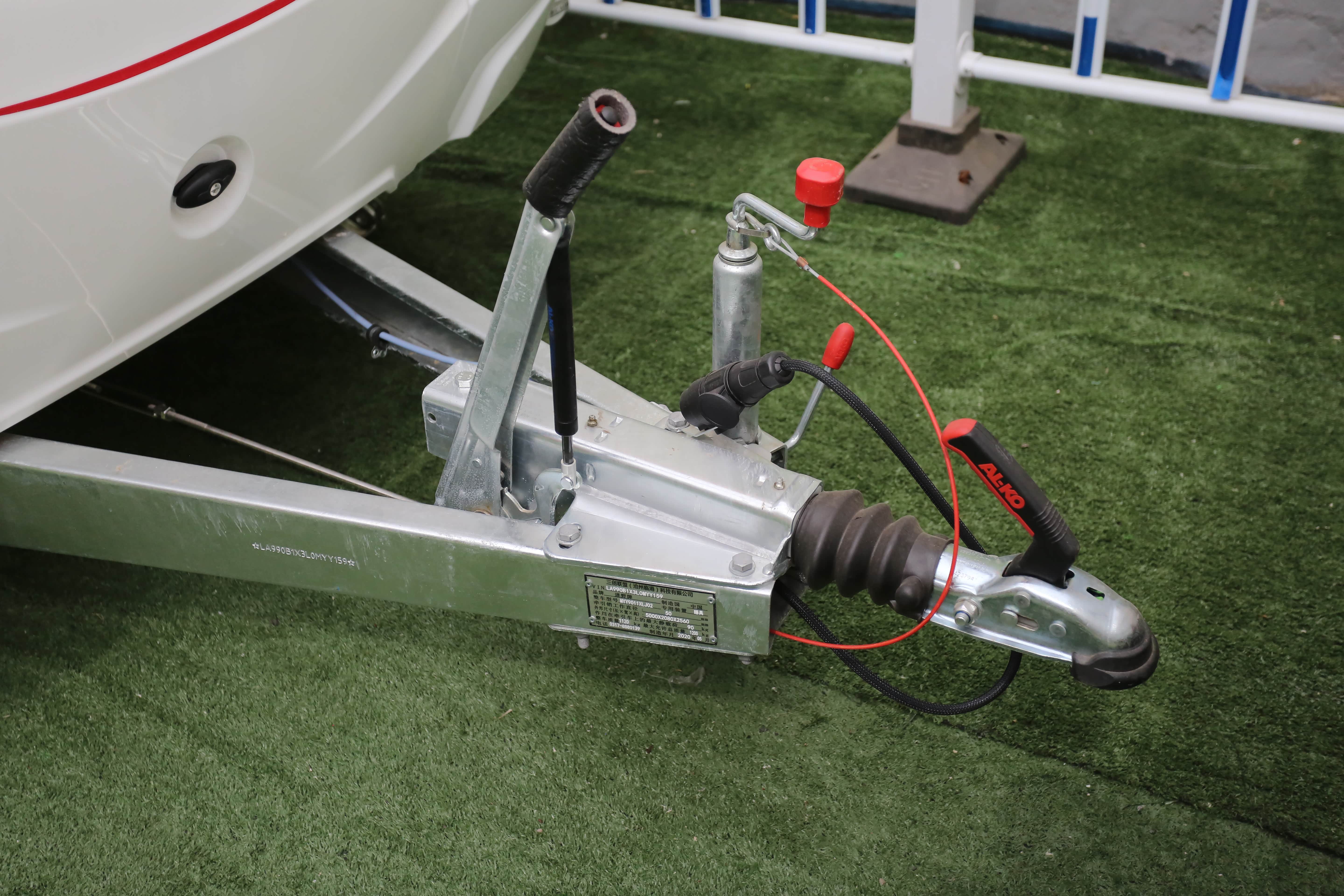 这款拖挂房车采用的是热镀锌底盘,搭配爱科(AL-KO)的扭力轴和导向轮,牵引头50毫米,制动方式是惯性同步制动。