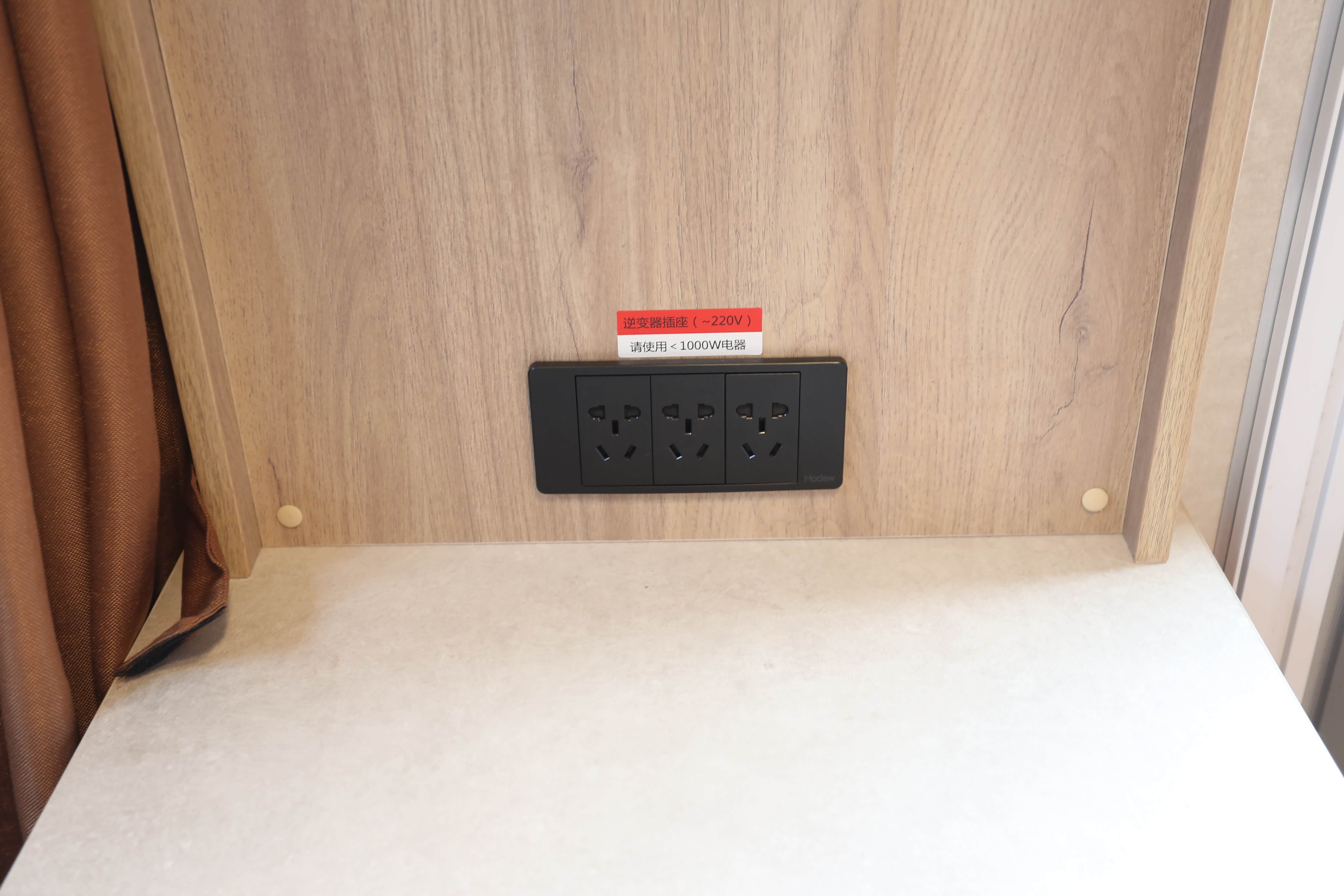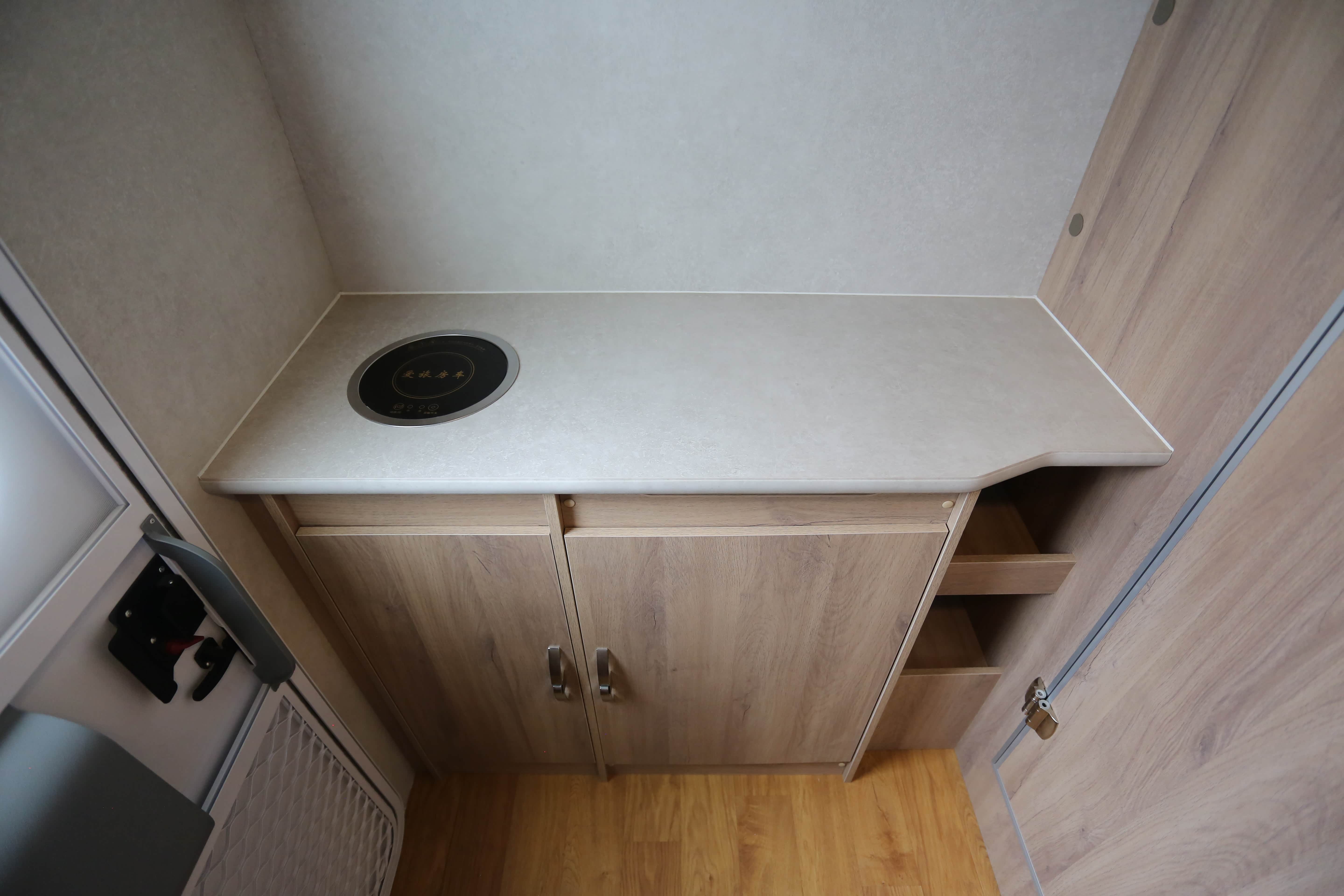 车尾的厨房台面上配有一个电磁炉,可以满足在车内烧水煮面的需求。如果想要做“大菜”的话,车内还安装了插座,可以外接一个炉灶来完成。