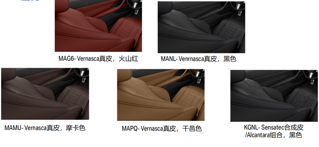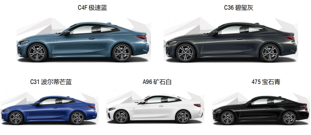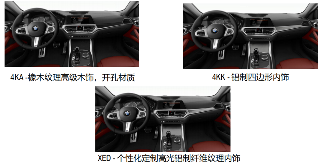 425i和430i两款车型都标配4款车漆,包括波尔蒂芒蓝、极速蓝、矿石白、宝石青,同时均可选配碧玺灰(9900元),这个车漆在国内只有旗舰7系和8系才配备;有四种Vernasca真皮内饰颜色以及Sensatec合成皮/Alcantara组合可供选择。