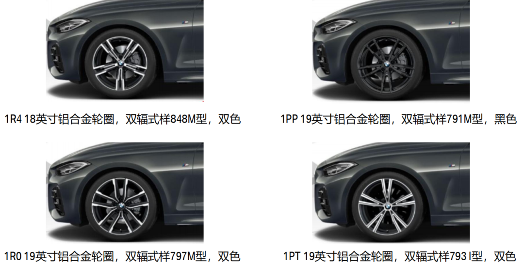 入门版425i配备18英寸双辐式848M型双色轮毂;中配425i配备19英寸双辐式791M黑色轮毂,可选装19寸793型双色轮毂(14200元);而高配430i标配19寸双辐式797M型轮毂,可免费选装791M,同时也可选793型轮毂(14200元)。