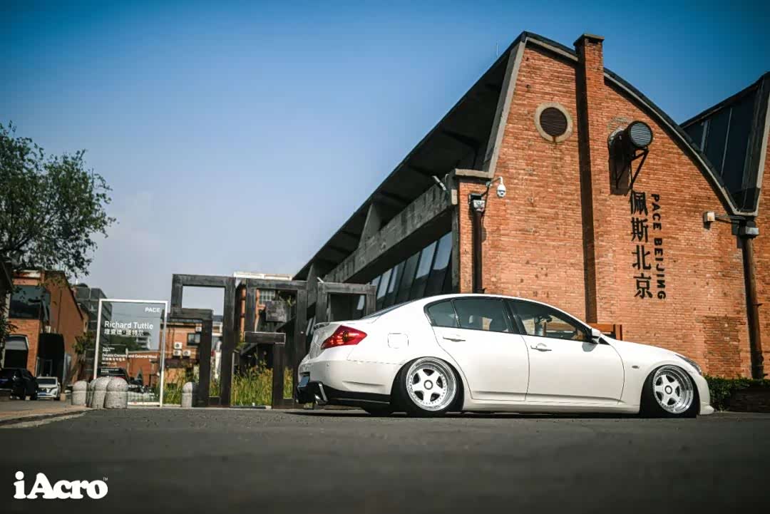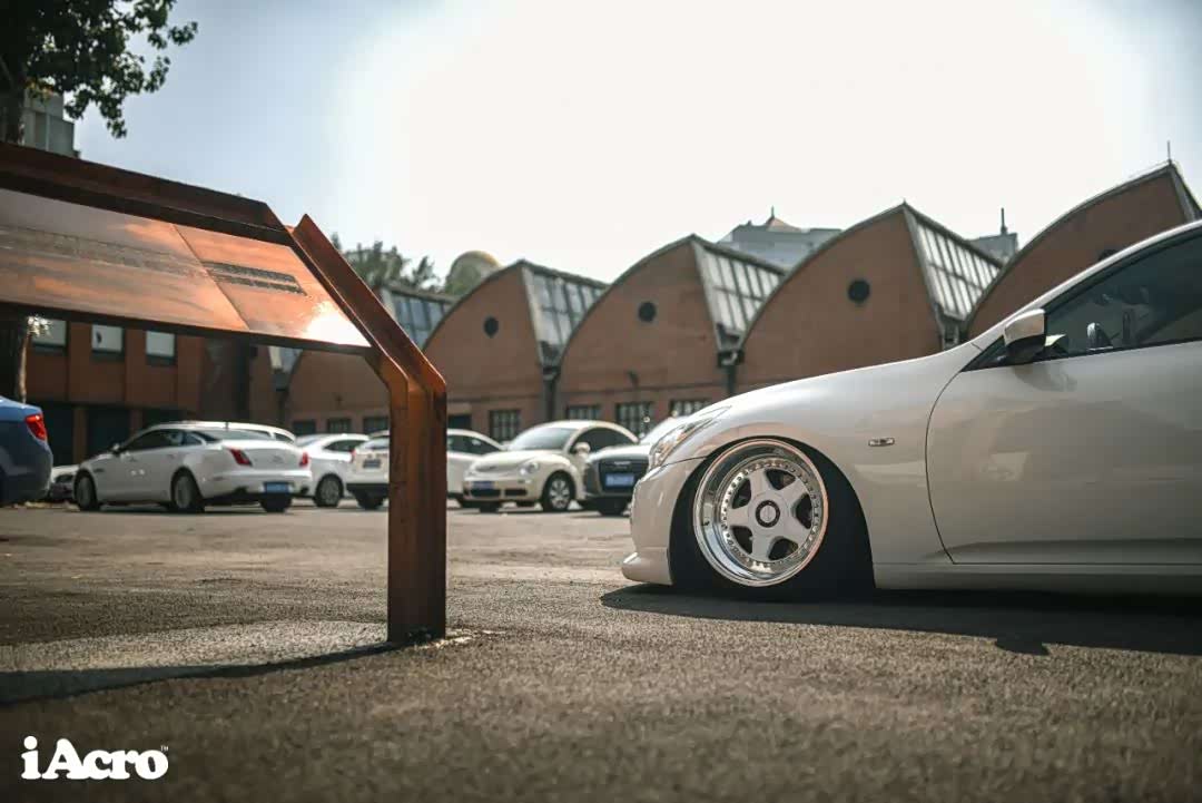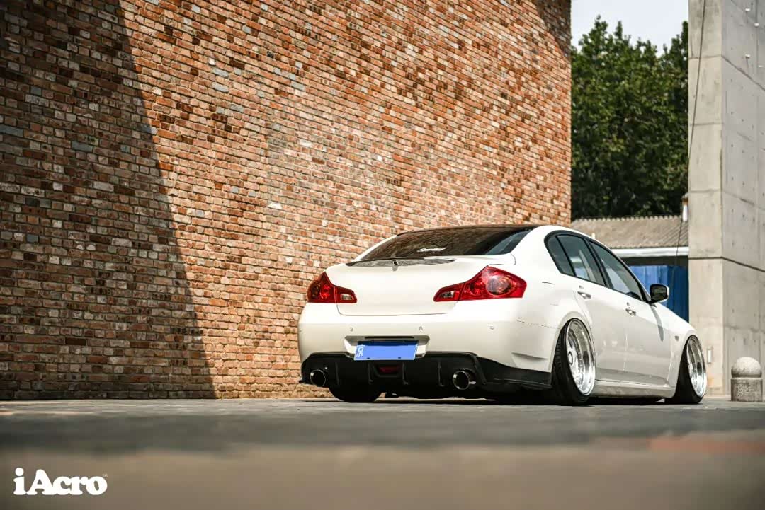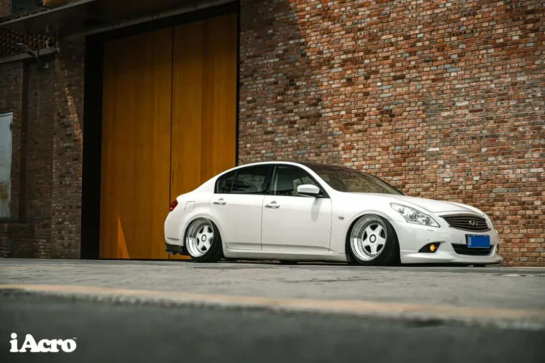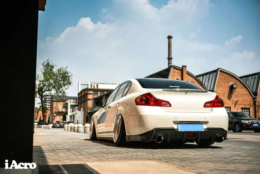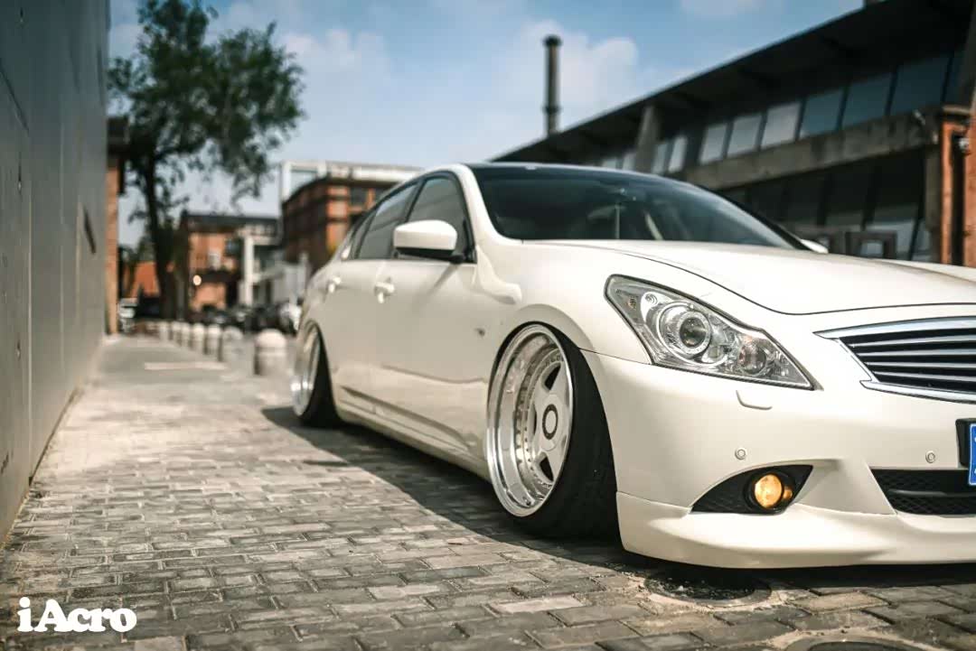 在英菲尼迪还没有为全系车型改名换姓的时期,当时那些车型可以说是将品牌概念普及给了大家,也是让我们印象最为深刻的一代。相比继任者Q50,当时感觉颇具侵略性的G37在样貌上也显得内敛了不少。拥有过她的朋友一定知道这台车可选的改装部件着实有限,恰好车主格子中意简洁为主的整体风格。只是用一条前唇、Darwin Pro碳纤后扰流来对车身简单点缀,氛围营造就交给避震与轮圈完成。避免要素过多,素素静静就足矣。
