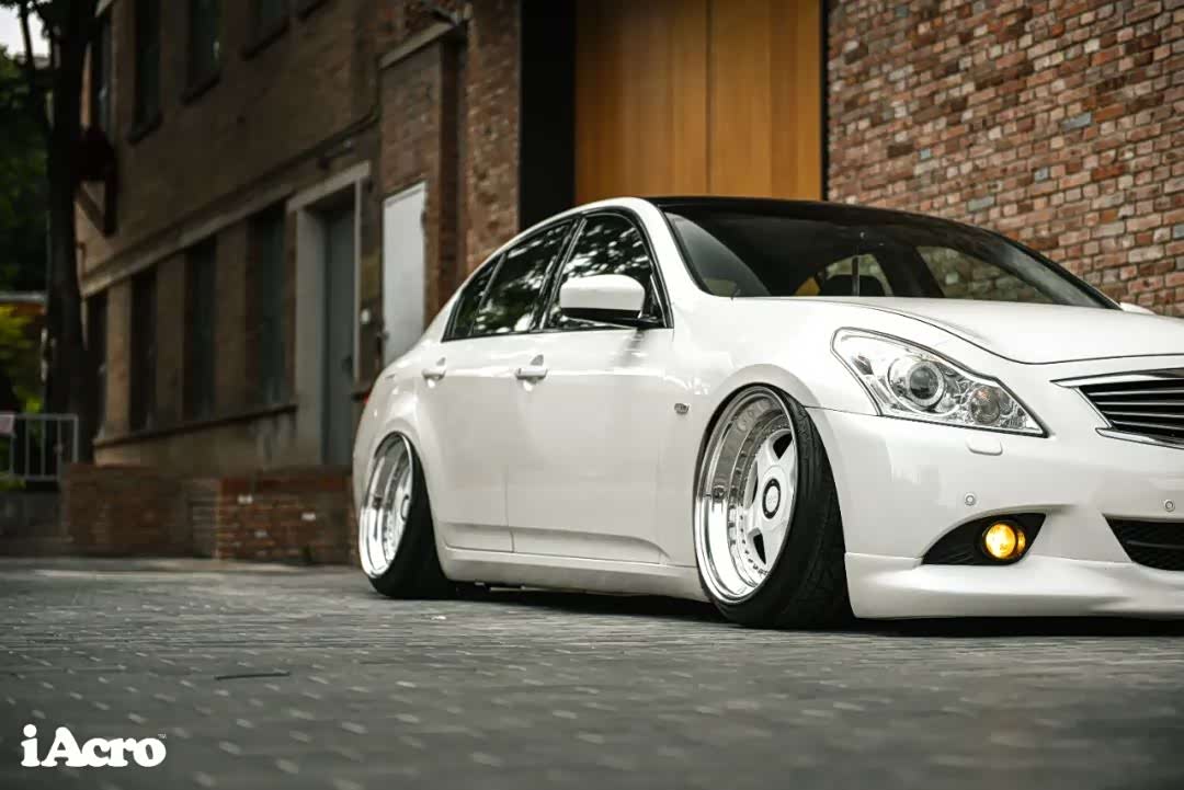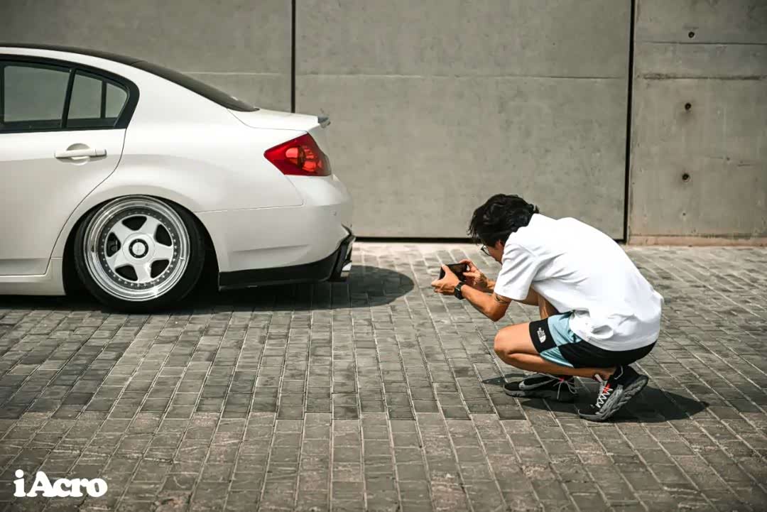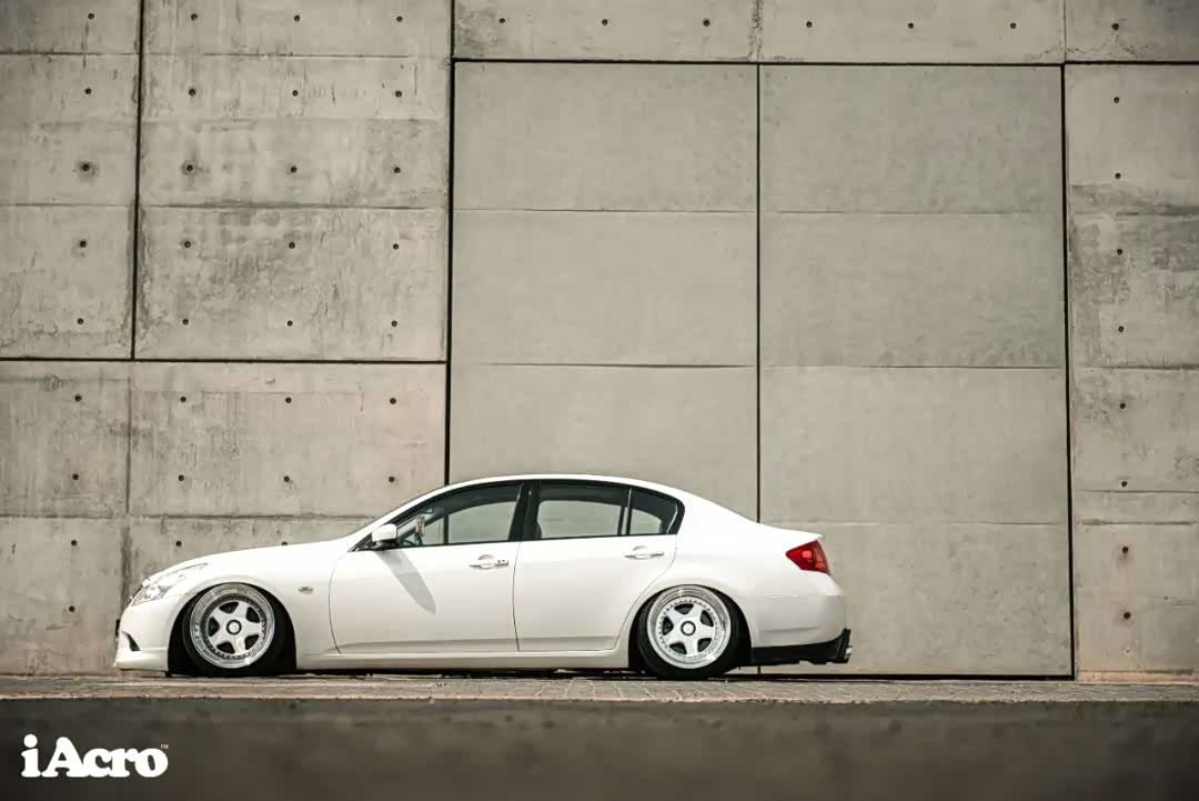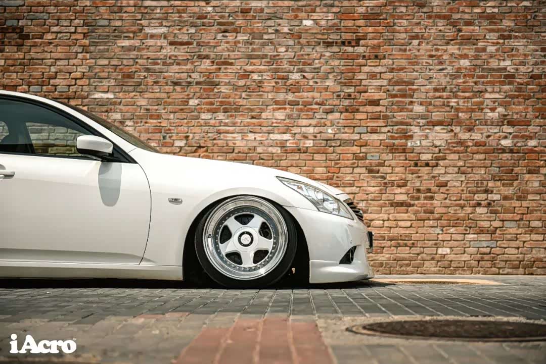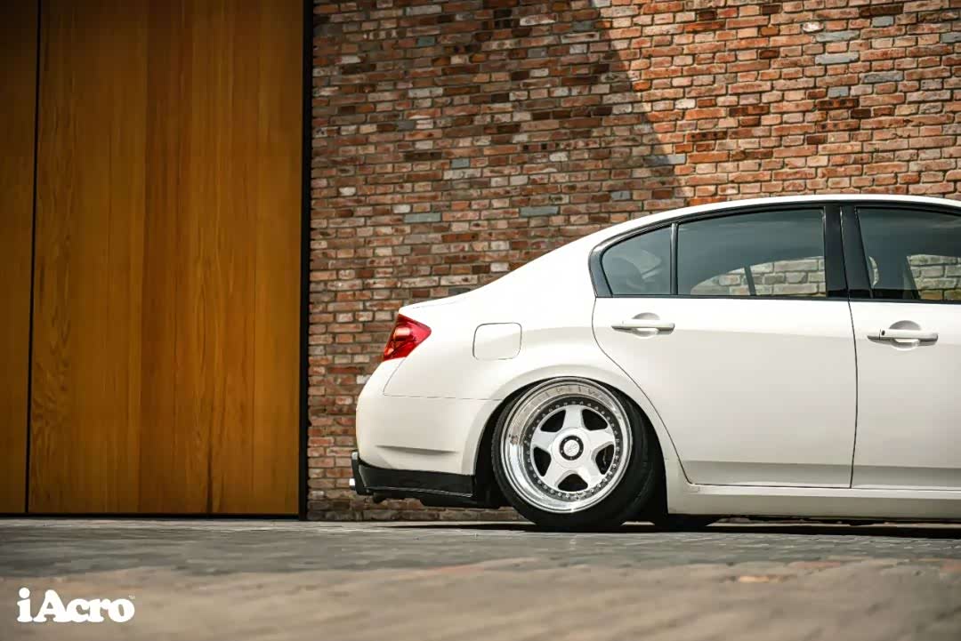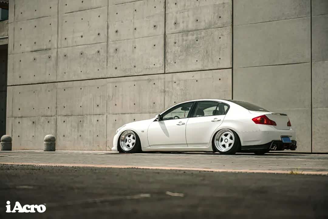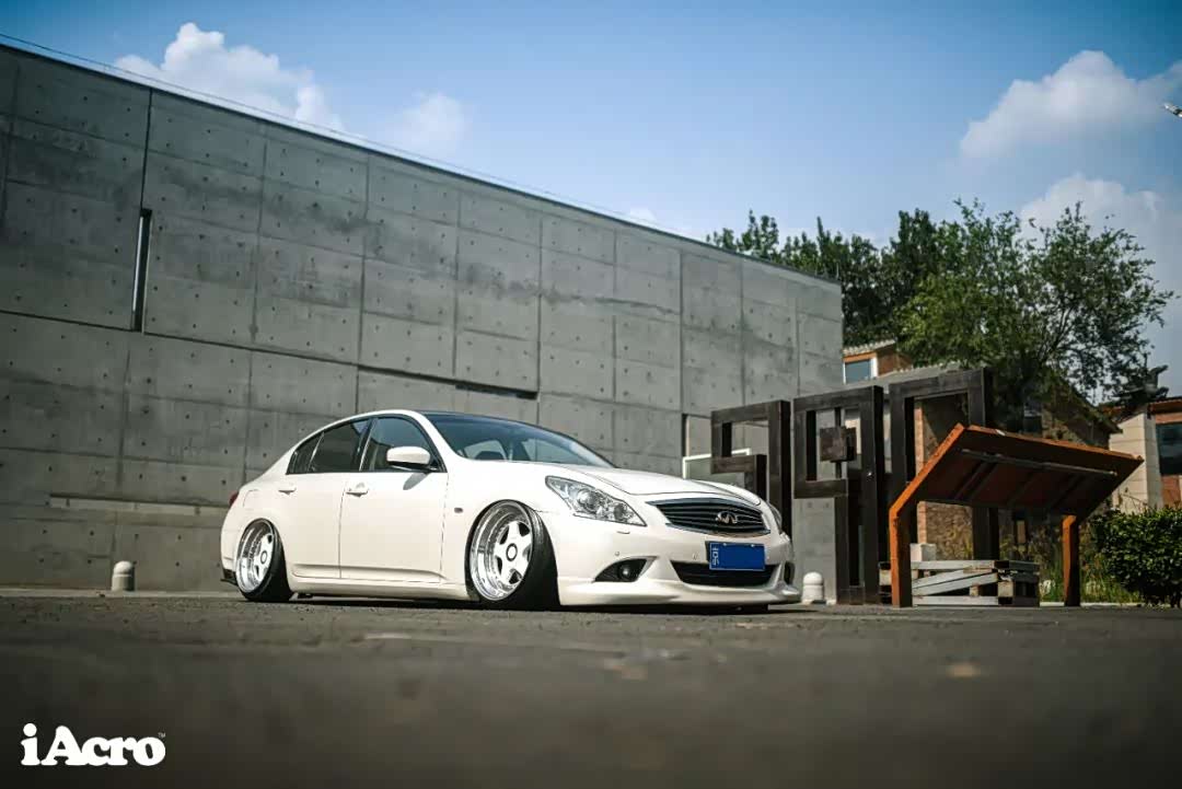 在英菲尼迪还没有为全系车型改名换姓的时期,当时那些车型可以说是将品牌概念普及给了大家,也是让我们印象最为深刻的一代。相比继任者Q50,当时感觉颇具侵略性的G37在样貌上也显得内敛了不少。拥有过她的朋友一定知道这台车可选的改装部件着实有限,恰好车主格子中意简洁为主的整体风格。只是用一条前唇、Darwin Pro碳纤后扰流来对车身简单点缀,氛围营造就交给避震与轮圈完成。避免要素过多,素素静静就足矣。