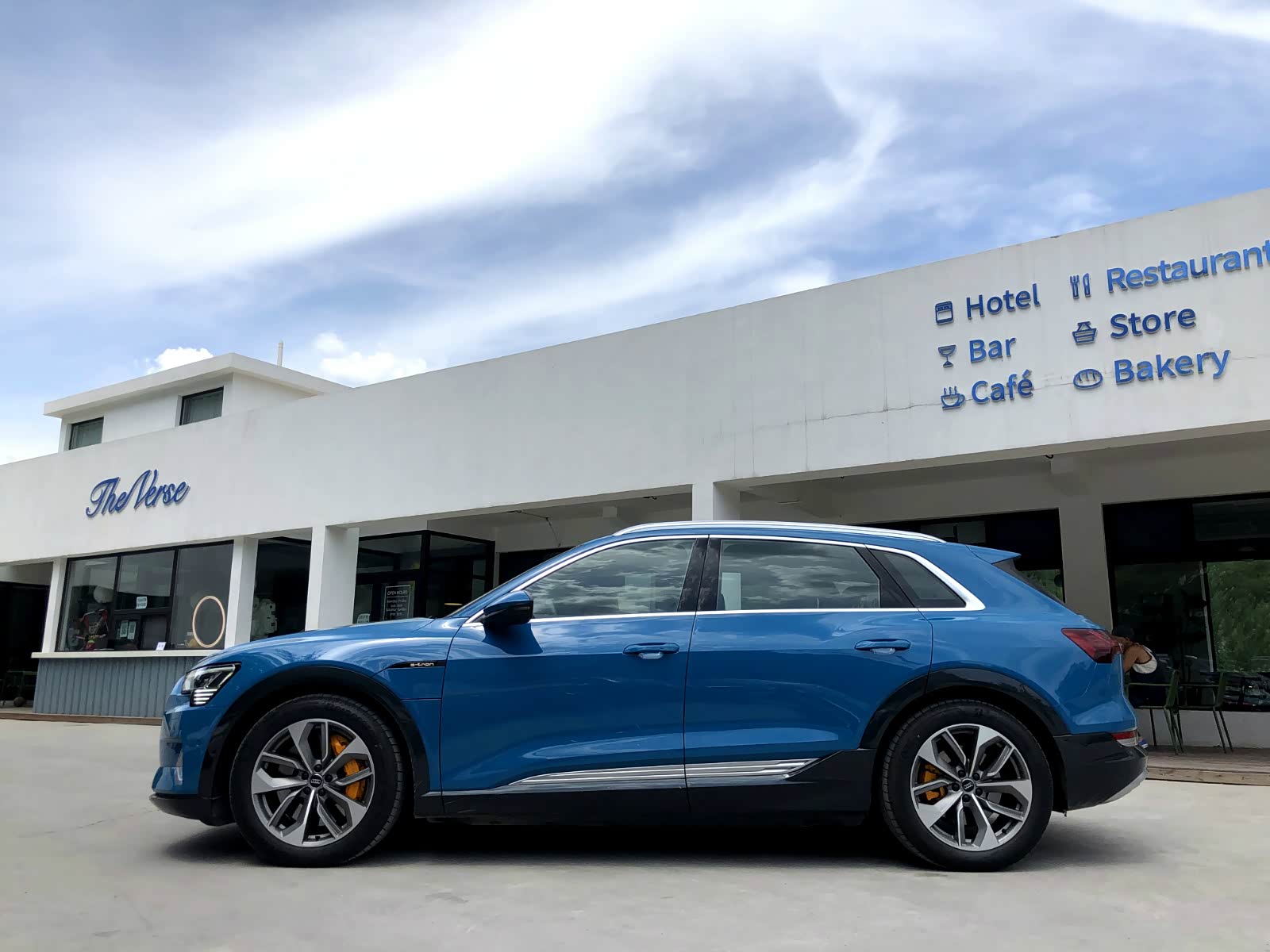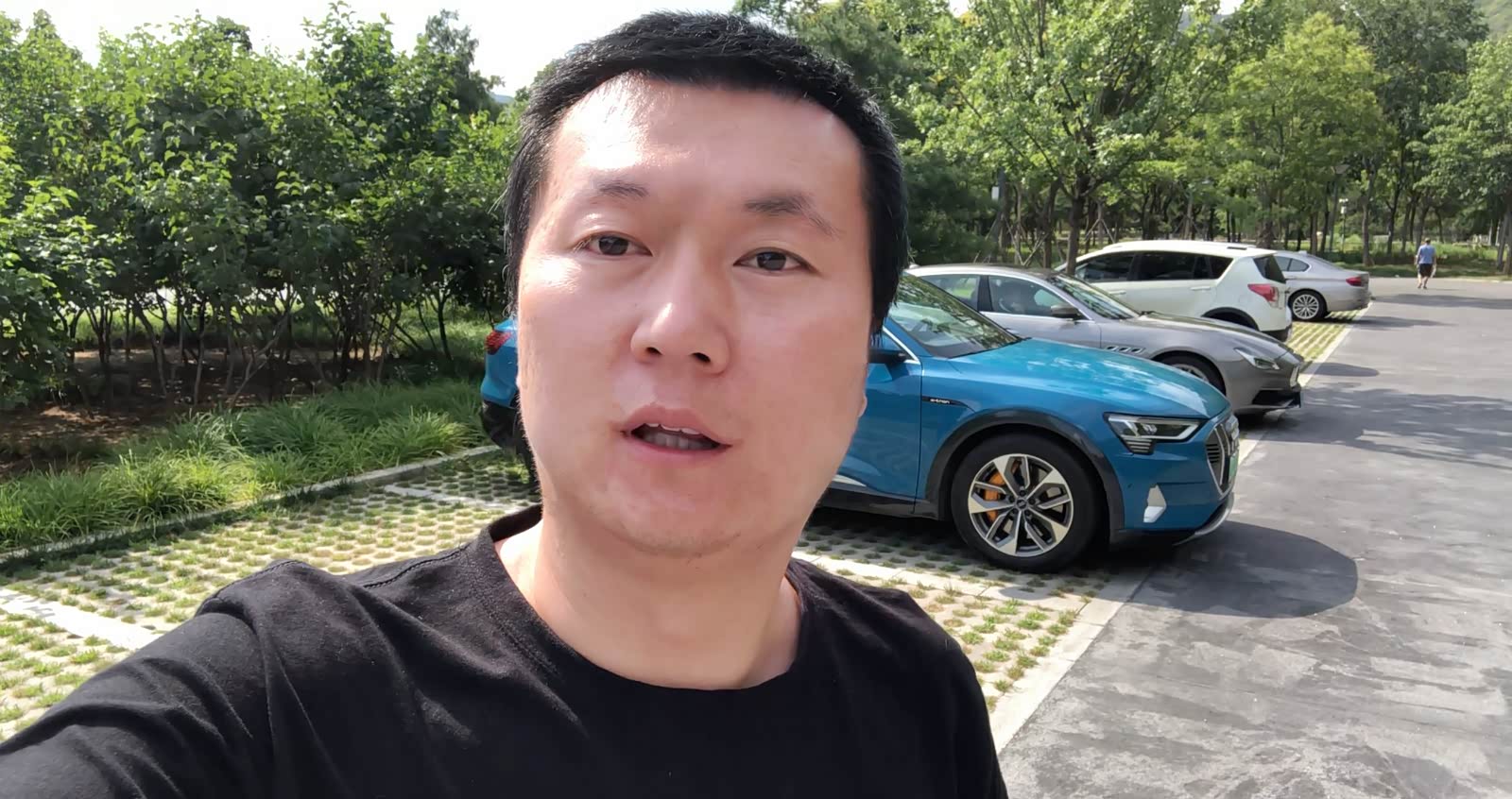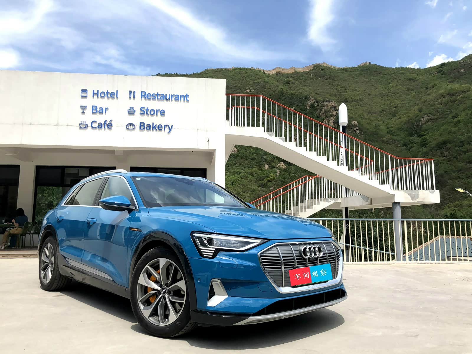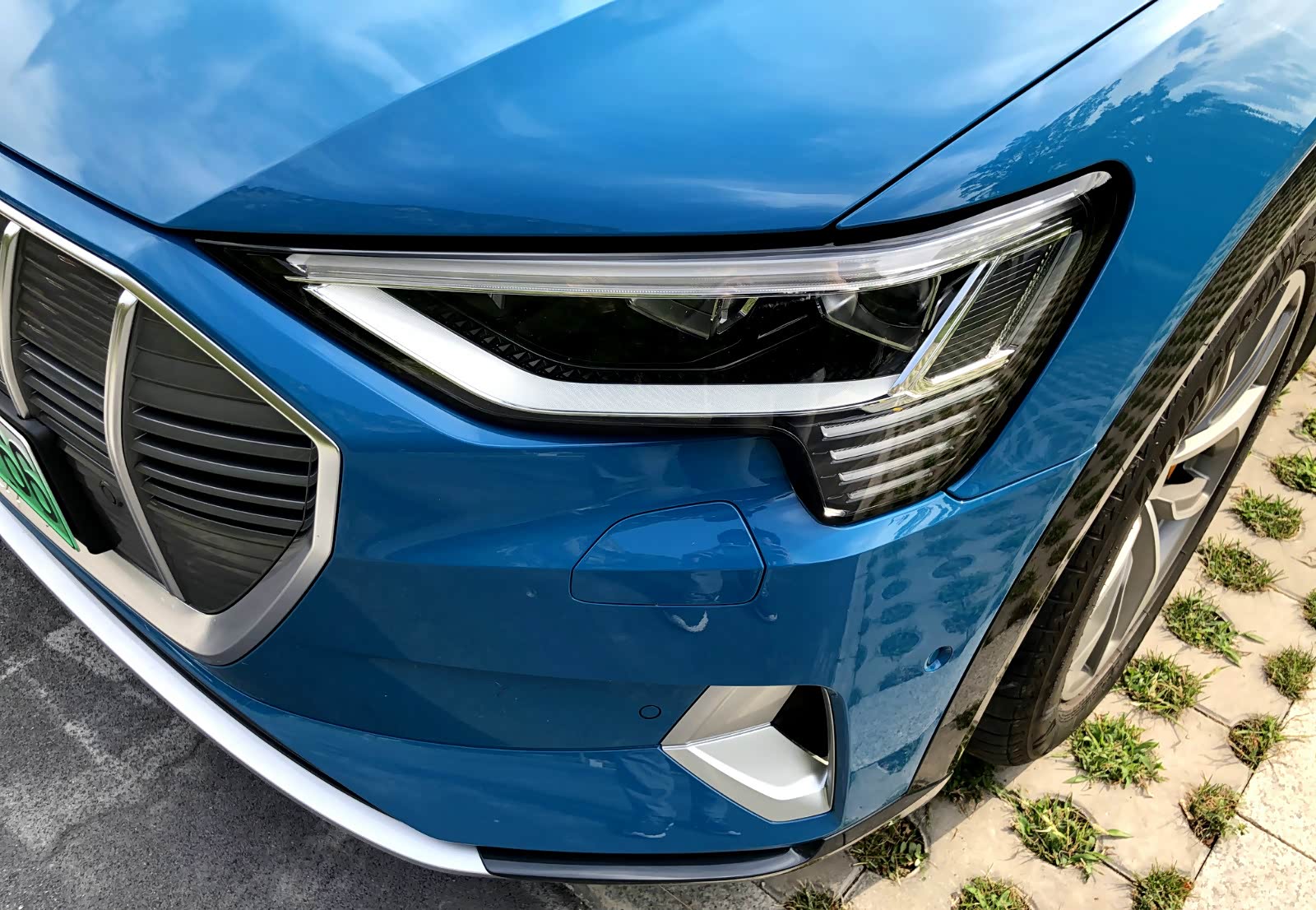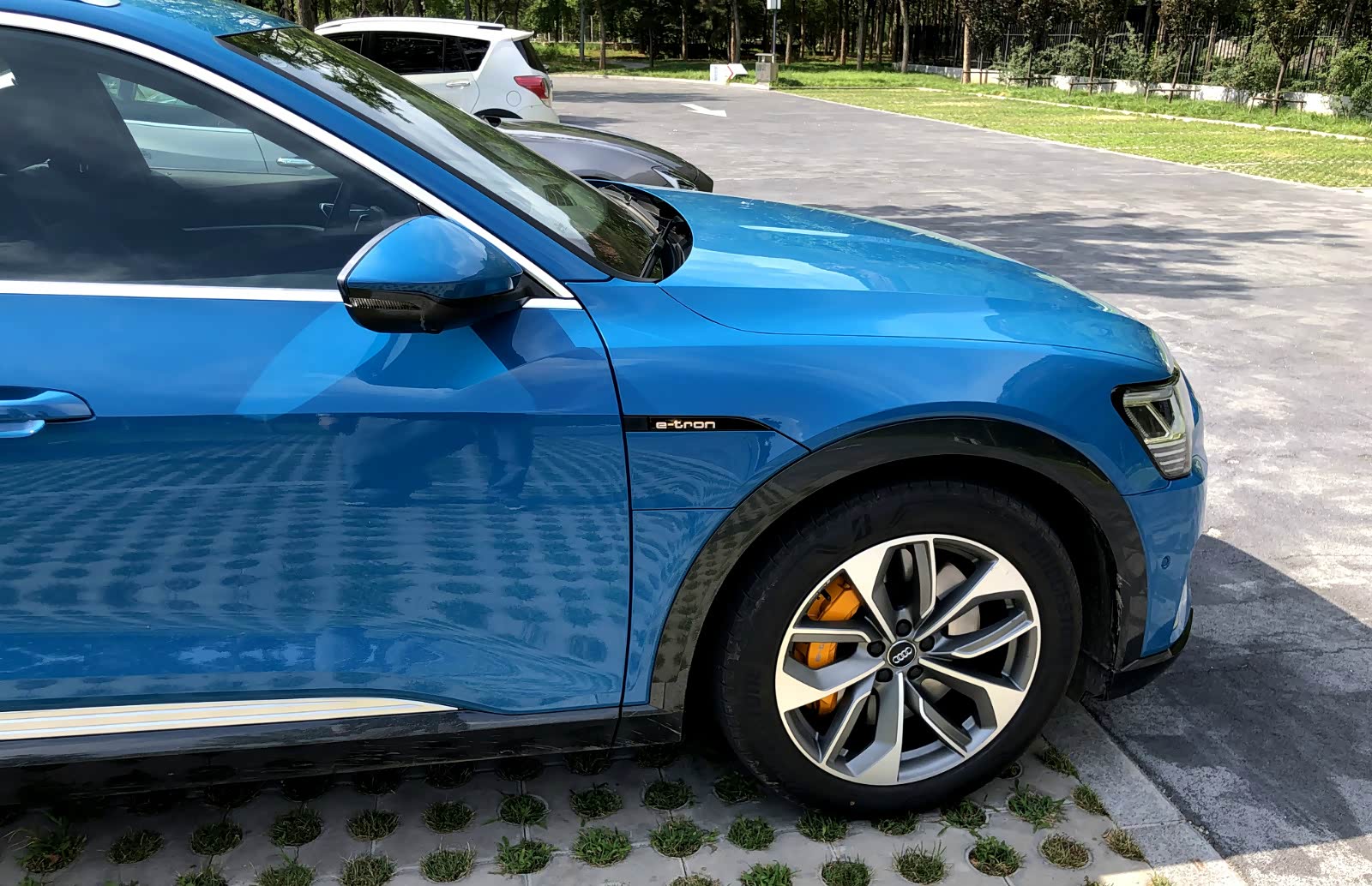 奥迪e-tron作为一款中大型SUV,身材尺寸介于Q5和Q7之间,长宽高分别为4901*1935*1628mm,轴距达到了2928mm。整车外观有11种颜色可选,内饰也有4种配色可自由选择,本文车型颜色为安提瓜蓝,也是察哥认为最好看的颜色之一。