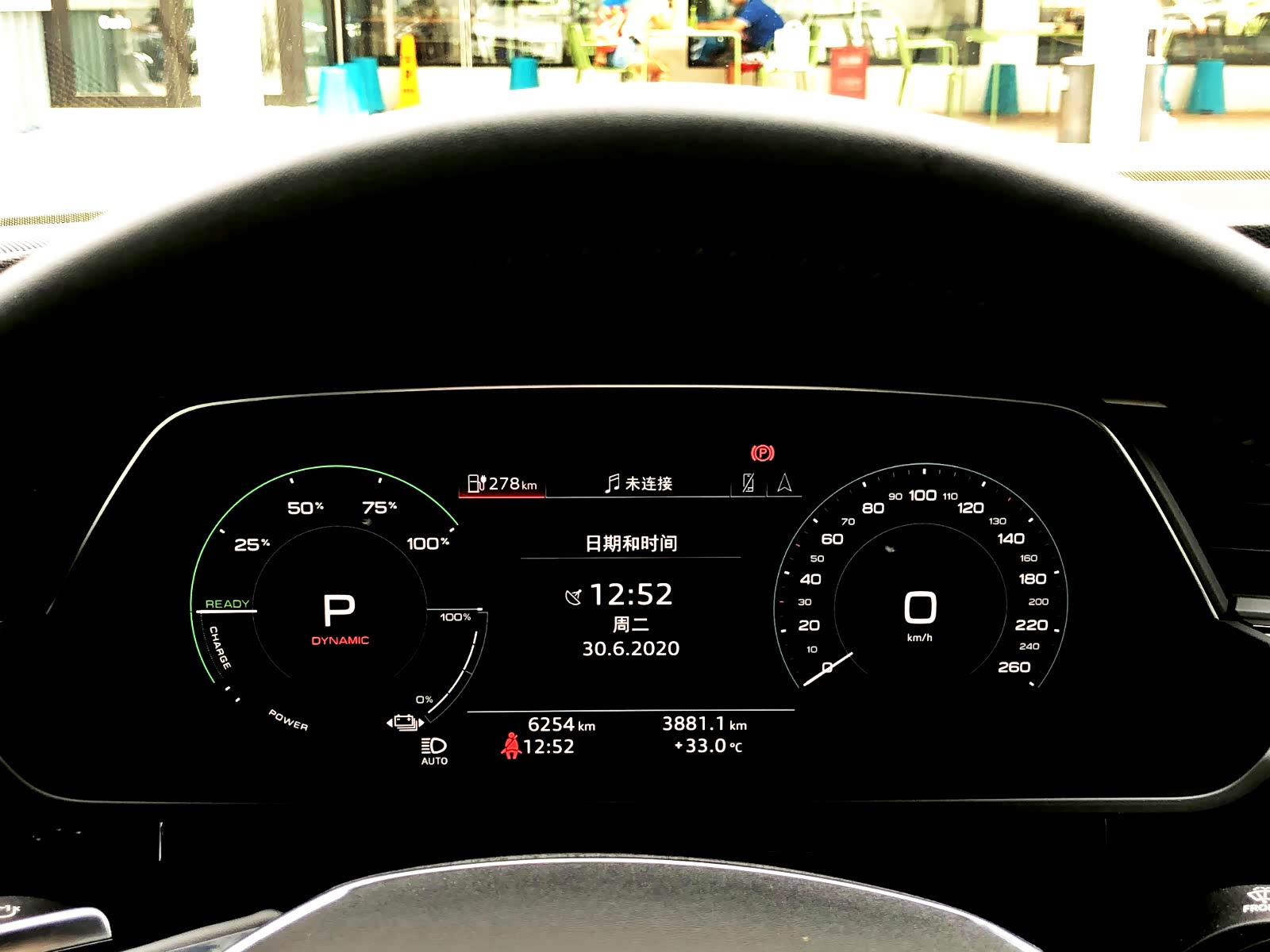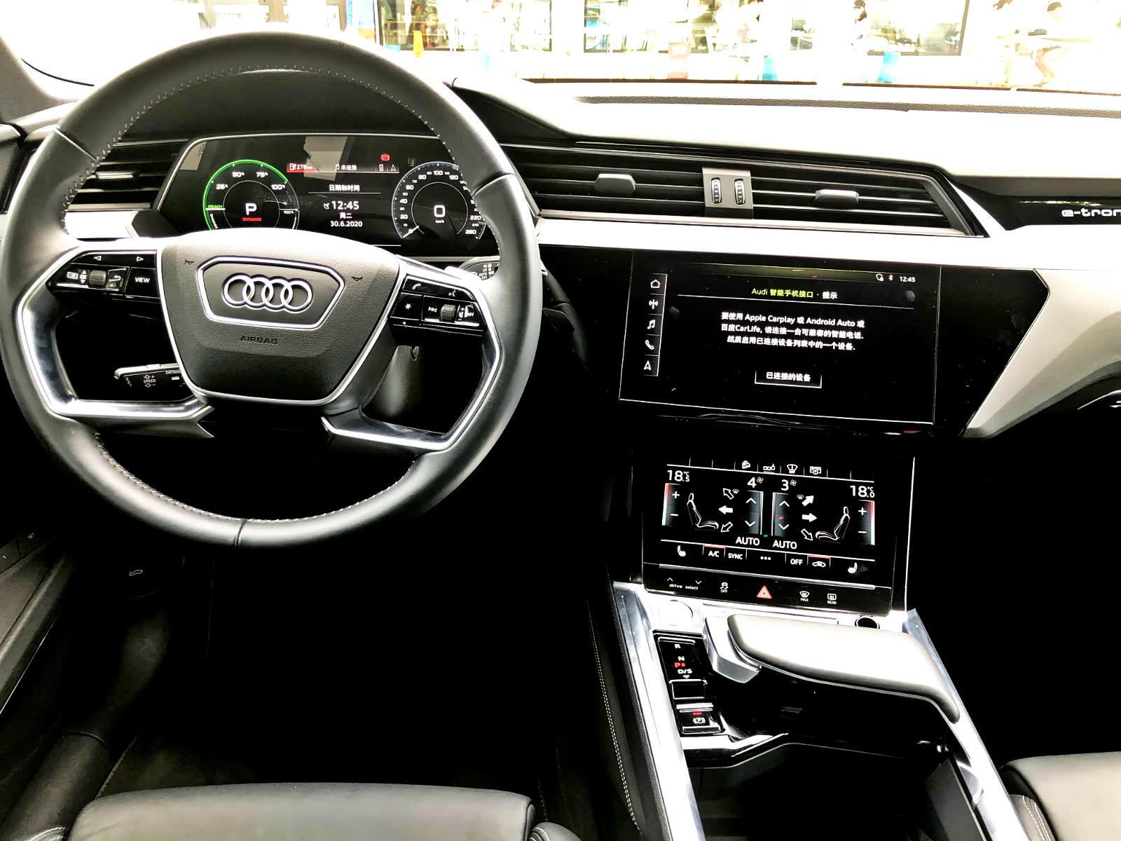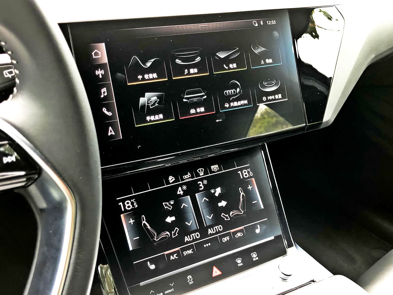 中控液晶屏幕分为两个区域,上面较大的一块屏幕为10.1英寸,下面较小的一块为8.6英寸。上面屏幕主要调节车辆的一些常用功能和多媒体控制如:音乐、导航和MMI设置等等,还可显示并调节360度全景影像;小屏幕主要功能是调节空调风量和温度等(最低配车型无后排独立空调)。e-tron支持CarPlay和CarLife功能,插上手机即可连接使用。