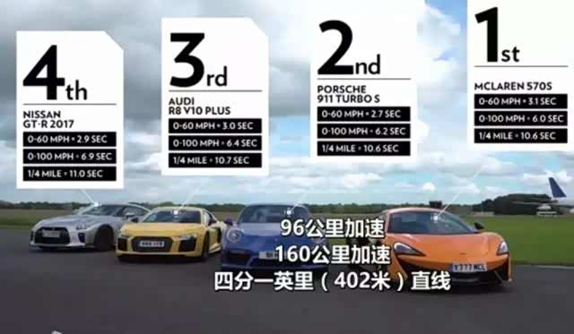 就在这年,著名汽车节目TopGear对2017款GT-R和奥迪R8 V10 PLUS、保时捷911 TURBO S、迈凯伦570S进行了一次400米直线加速赛,“战神”惨遭垫底。