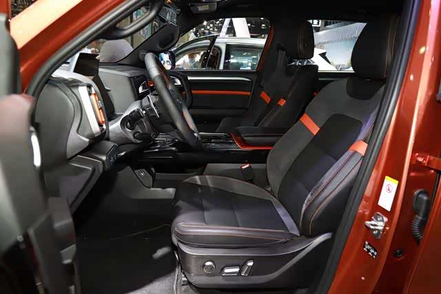 座椅的部分,采用橙色缝线和皮革拼接,前排有电动调节,后排有独立的出风口和USB。后备箱开口比较高,内部规整,座椅可以按照4/6比例放倒。