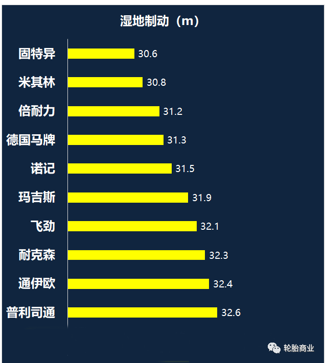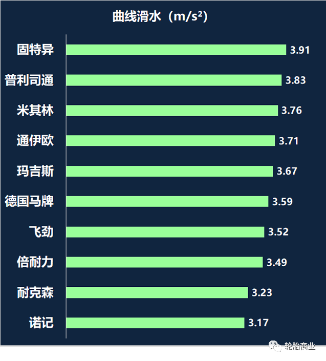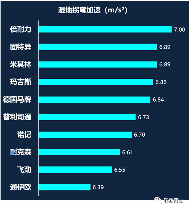 湿地拐弯加速测试环节中,加速越高成绩越好。倍耐力 P Zero位列第一,紧随其后的是固特异Eagle F1 Asymmetric 5和米其林Pilot Sport 4并列第二,来自中国的玛吉斯 Victra Sport 5在本轮测试中名列第三,超越马牌、普利司通等外资大牌。来自日本的通伊欧Proxes Sport落在最后一名。