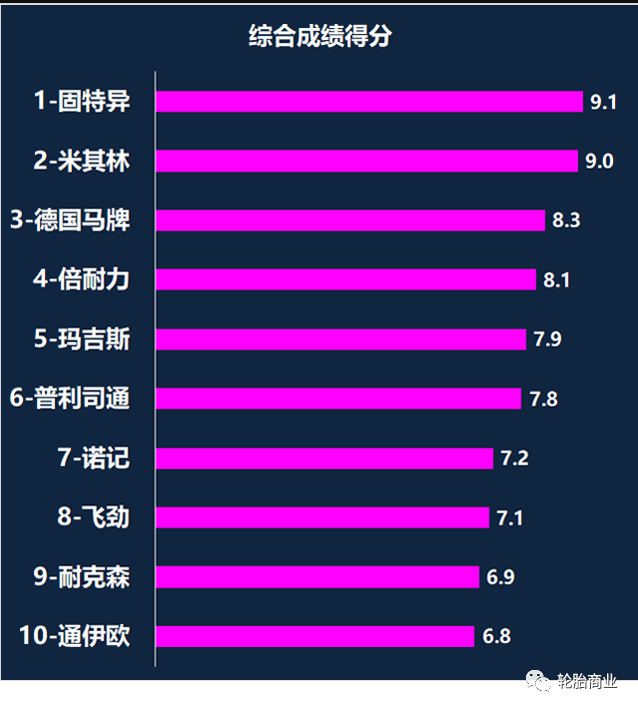 综合成绩得分还融合了驾驶员湿地驾驶和干地驾驶以及舒适度等方面的主观评分,最终固特异Eagle F1 Asymmetric 5以微弱优势战胜米其林Pilot Sport 4站上冠军领奖台,目前固特异这款轮胎尚未在中国市场上市,目前中国市场销售的是固特异Eagle F1 Asymmetric 3。固特异鹰驰系列被中国车主称之为弯道之王,是众多运动车型玩家的挚爱。