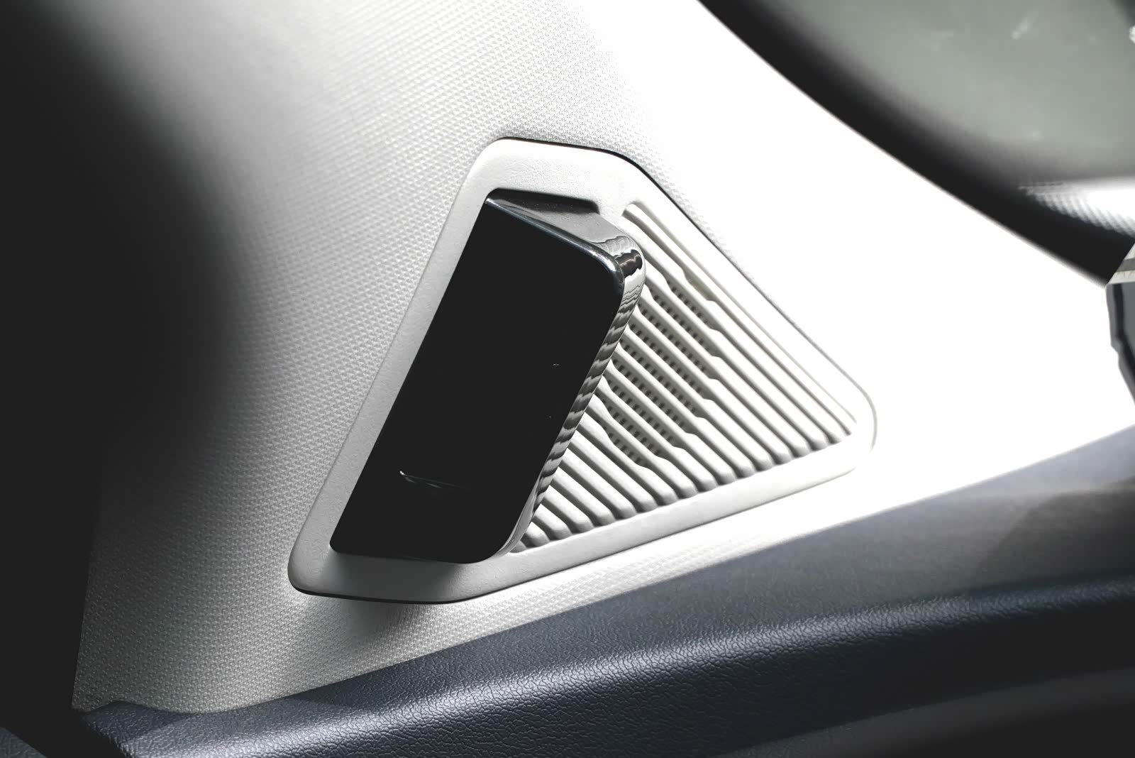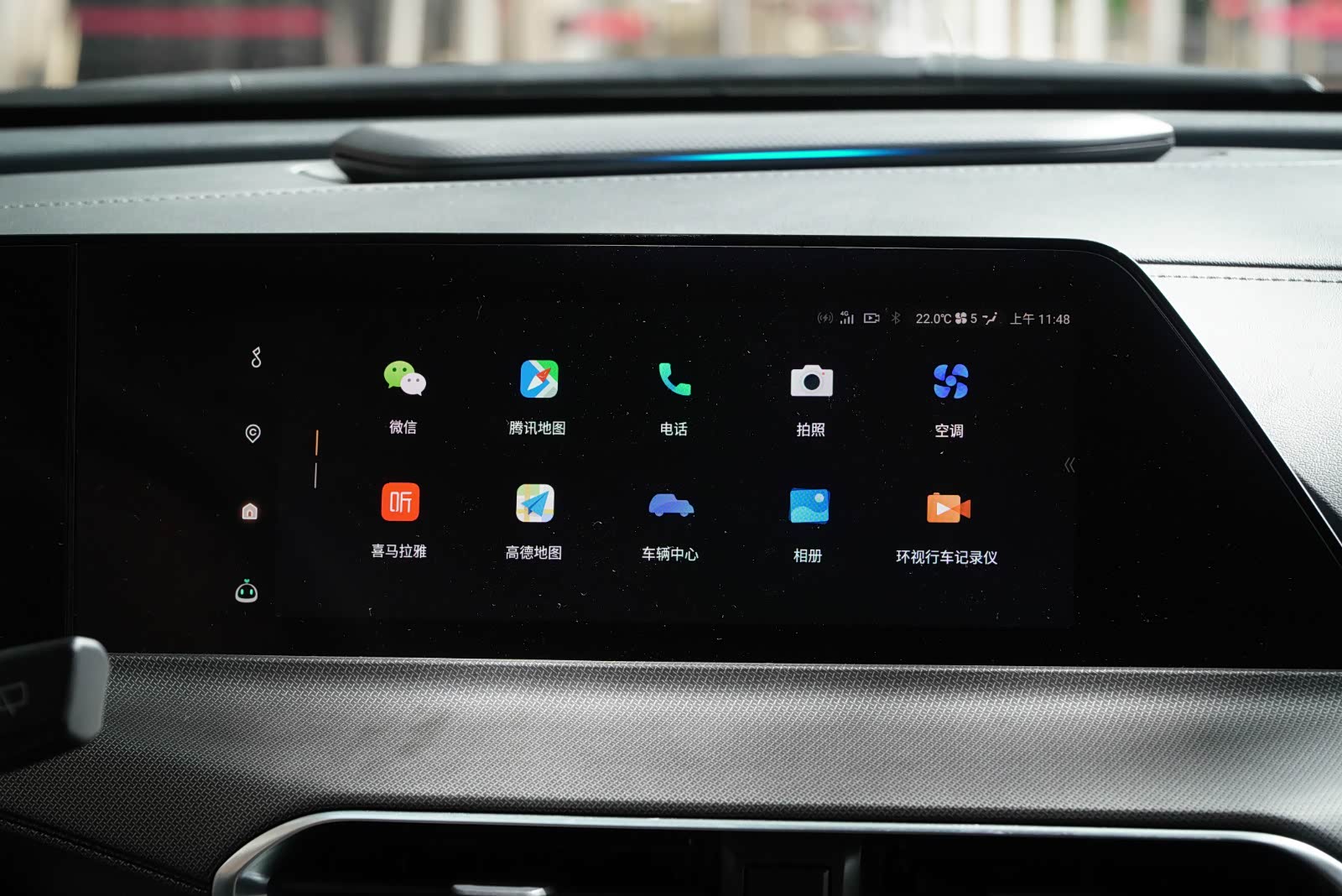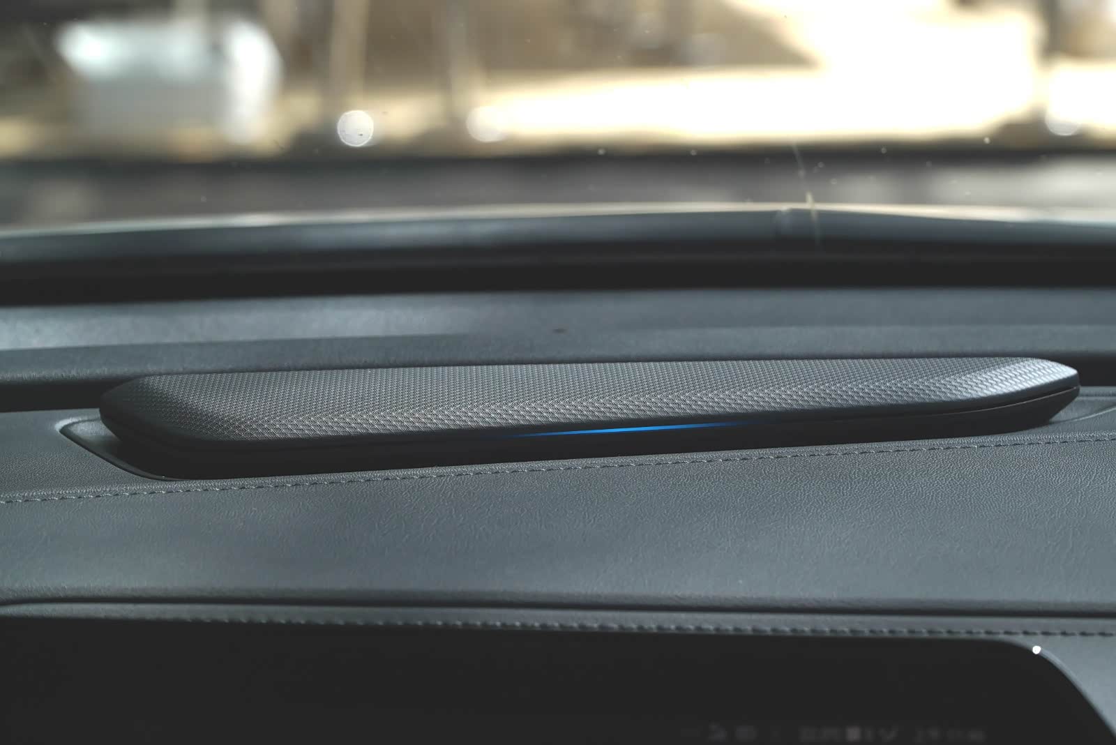 中控台上这个长得很像音响的东西,官方称之为智能载体,它能够与语音交互、碰撞预警、ACC自适应巡航、疲劳驾驶等功能进行联动,通过灯光颜色和闪烁进行变换来提示驾驶员。