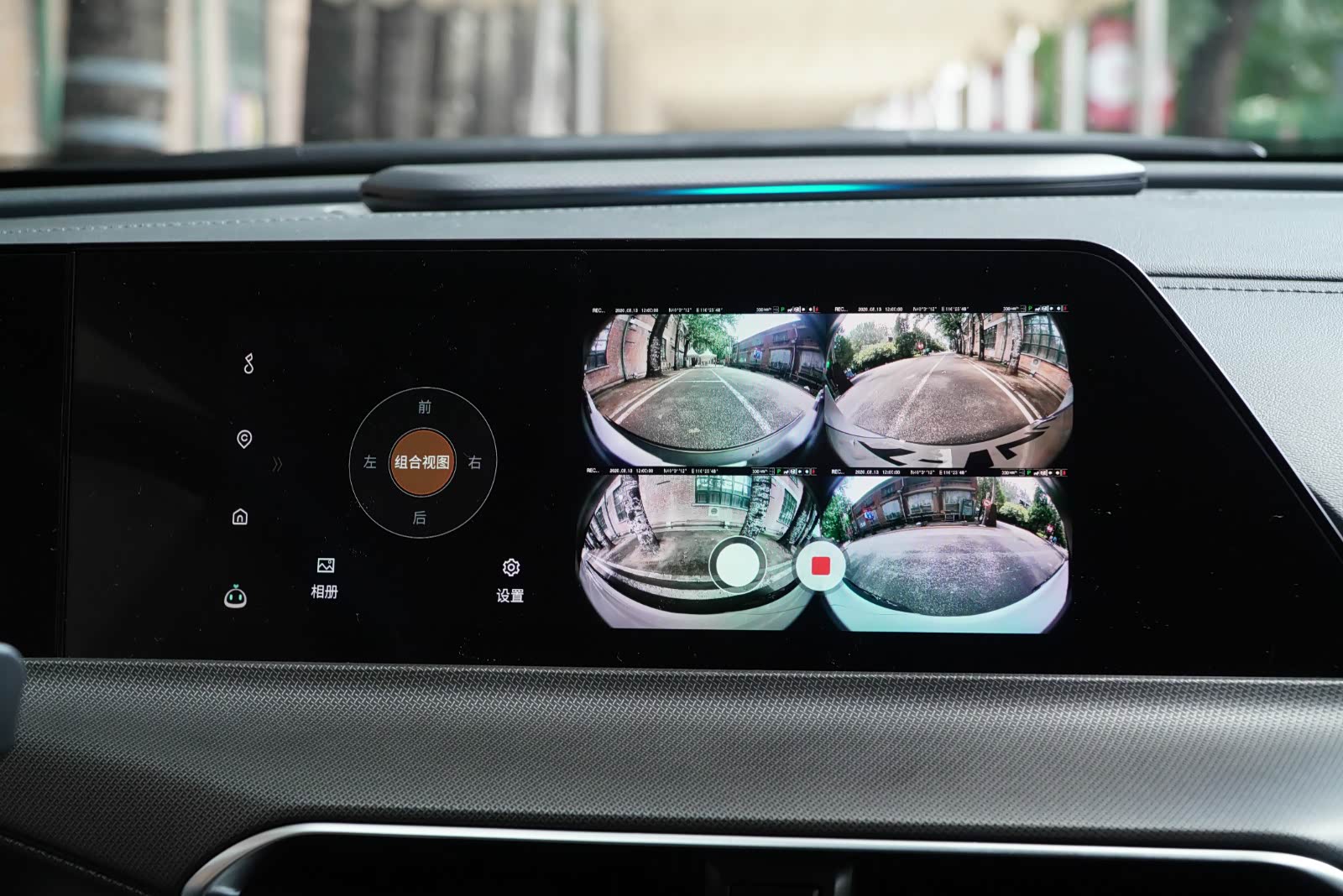 顶配车型提供自动泊车,同时支持远程全自动泊车,悬浮挡杆右侧设置了一组快捷键控制区域,包含了360°全景影像、行车记录仪紧急保存、内置摄像头拍照以及自动泊车功能,其中行车记录仪功能提供前/后/左/右四个视角,乘客还能够在车内拍照及录制。