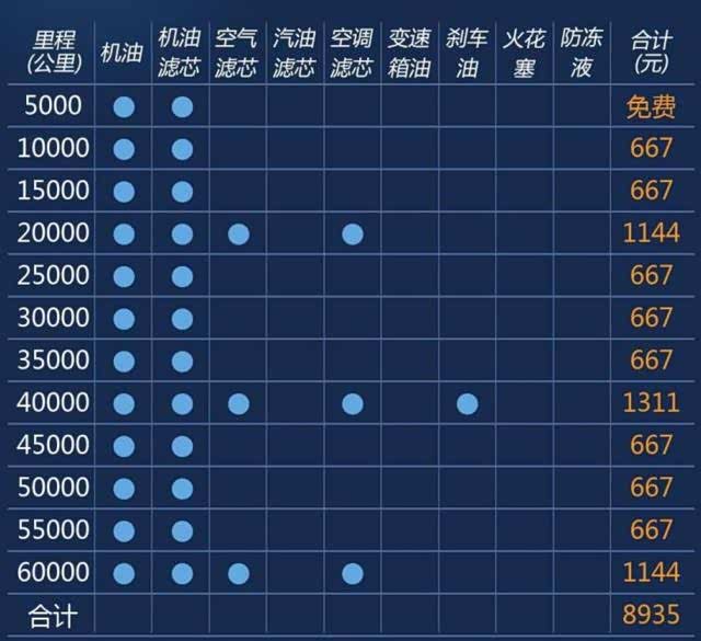 所谓买车容易养车难,其中难就难在车辆的保养上。从天籁的保养手册来看,车辆保养周期为5000公里一保,从费用明细来看,单次保养费用在三四百左右,按照每年10000公里行驶里程来计算,6年60000公里月花费8953元,平均每年约1489元,另外工时费和优惠另算。另外当车辆达到6万公里之后,变速箱油和火花塞需要定期更换,而这两个零件的费用相对较高。
