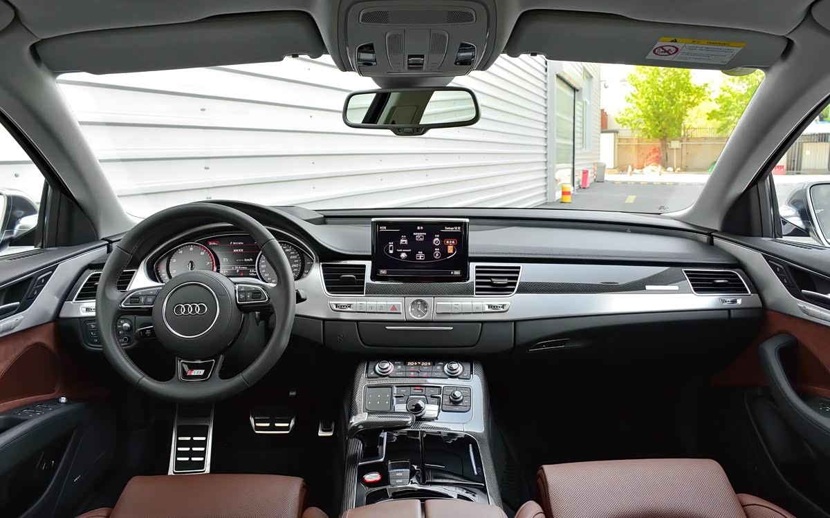 进入车内,S8的内饰大致上依旧延续了稳重、豪华的设计风格,只不过将中控部分原有的桃木饰板,替换成了碳纤维饰板,更符合S8作为高性能车型的定位。另外,方向盘也采用了更为运动的三幅式,加之背后的换挡拨片,使车内氛围更具有驾驶气息。