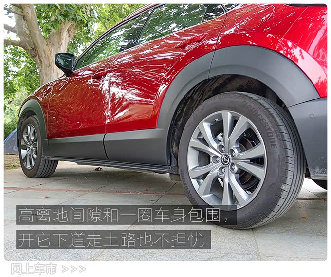 从侧面看上去,长安马自达CX-30车身线条比一般两厢车要更加饱满,一方面昭示它和两厢版马自达3的差异,一方面也为车内空间留下了伏笔。年轻人不应该过早地开大车,短小精悍的尺寸在拥挤的大城市中走街串巷更为得心应手,而较高的离地间隙,在外出郊游的时候就显示出优势了,走走非铺装土路完全没有担忧,偶尔下下河滩也能“全身而退”。