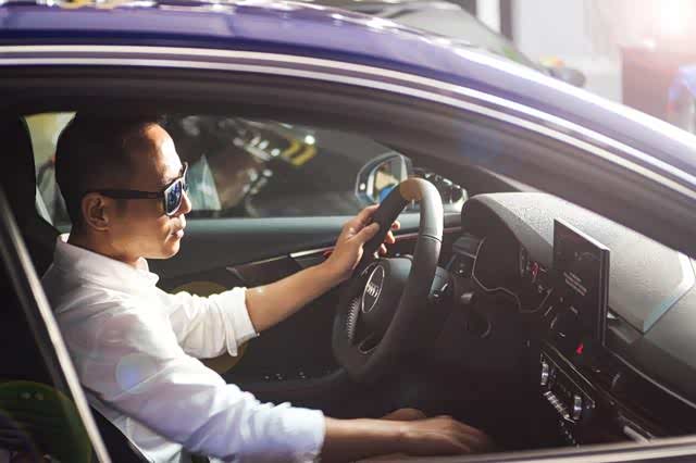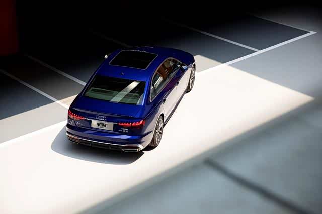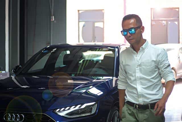 他的背后是一辆极精致的 奥迪A4L quattro,在盛夏日光的折射下,仿佛克什米尔蓝宝熠熠生辉。