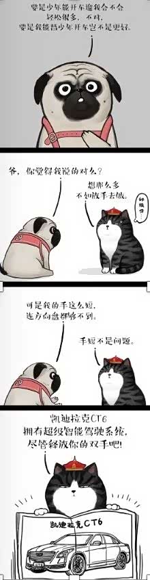 漫画讲述了主人公巴扎黑想要为主人减轻烦恼想到了遛狗开车甚至自己开车,吾皇建议它放手去做。但巴扎黑说自己手这么短,连方向盘都够不到,这个时候就引出了广告凯迪拉克CT6——超级智能驾驶系统,释放你的双手。