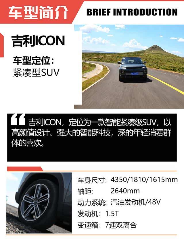 此次试驾的ICON,是吉利汽车全新推出的智能年轻化产品,定位为一款紧凑型SUV。在动力系统上,该车搭载的是1.5T涡轮增压发动机,并在部分车型上增加了48V轻混系统。传动部分,新车全系标配了7速双离合变速箱,整体的驾驶感受极为顺畅。