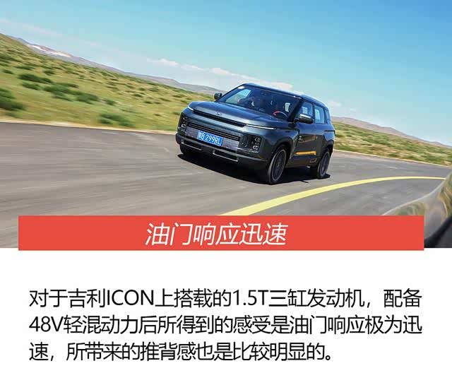首先,吉利ICON顶配以及次顶配车型上1.5T发动机搭配有48V轻混系统,在油门踏板上的调校算是比较迅速。起步时,只要轻点油门油门踏板便能平顺的输出动力。在高速路段,急加速超车时,发动机最大130kW功率以及255Nm的最大扭矩,并不会让你感受到一丝的拖沓感。