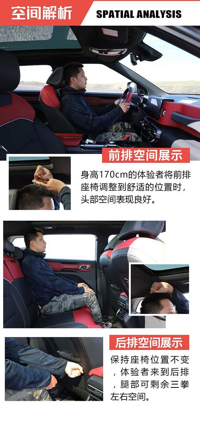最后在空间体验上,吉利ICON整体的表现还是比较让人满意。体验者来到前排,调整好座椅位置,前排头部可剩余一拳两指的空间,并不会带来过大的压抑感。保持前排座椅位置不变,同一体验者来到后排,头部可剩余一拳空间、腿部能剩余三拳左右空间。