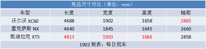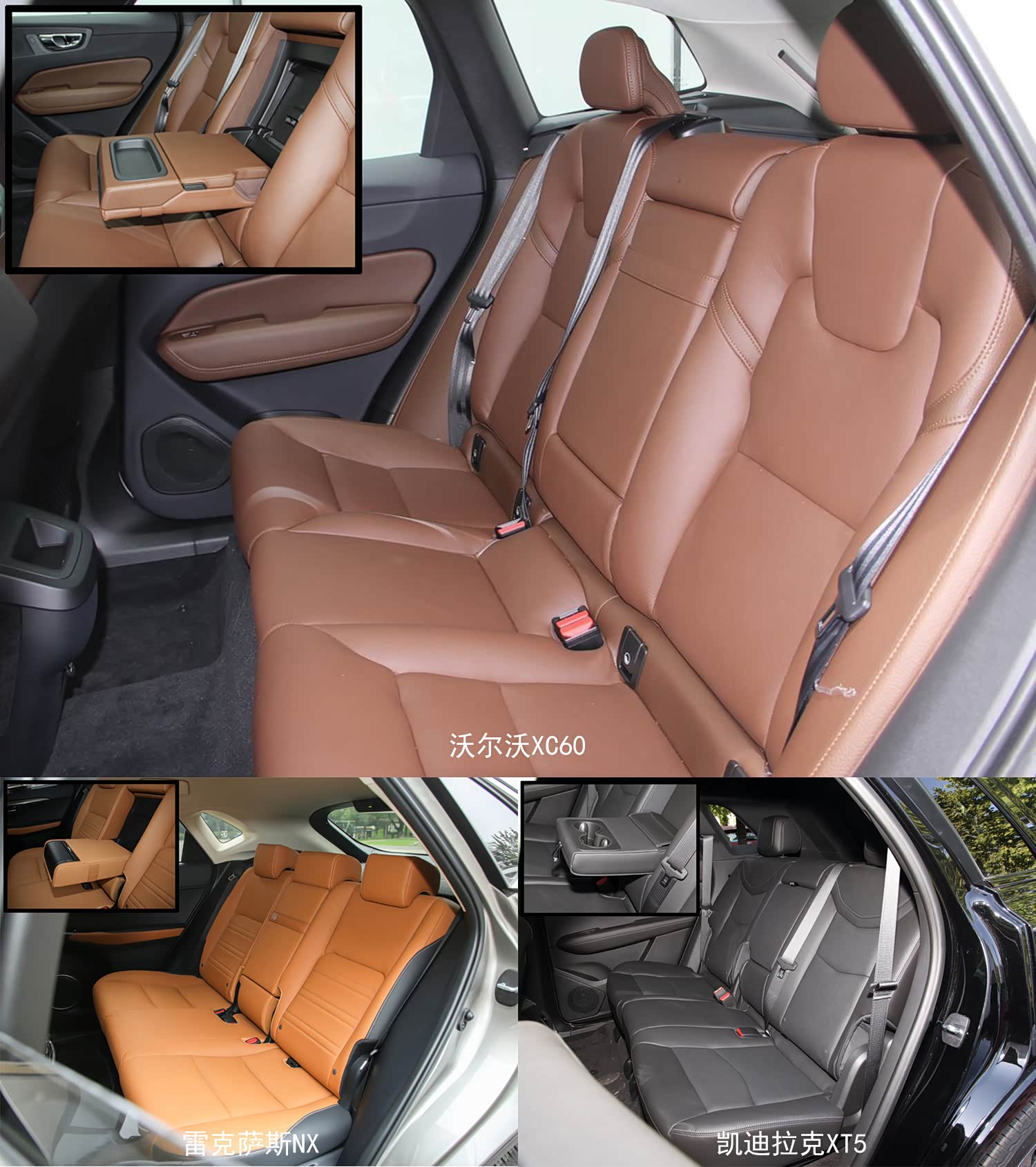 从上表可以看出,凯迪拉克XT5长宽高优势明显,气场方面可以说是完胜;沃尔沃XC60虽然长宽高都很一般,但轴距却是三车中最长的,对车厢空间的利用率会更高;雷克萨斯NX车身紧凑小巧,轴距也是最短,后排空间令人“捉急”,更适合小两口家庭,也有利于在狭窄的区域掉头挪车。