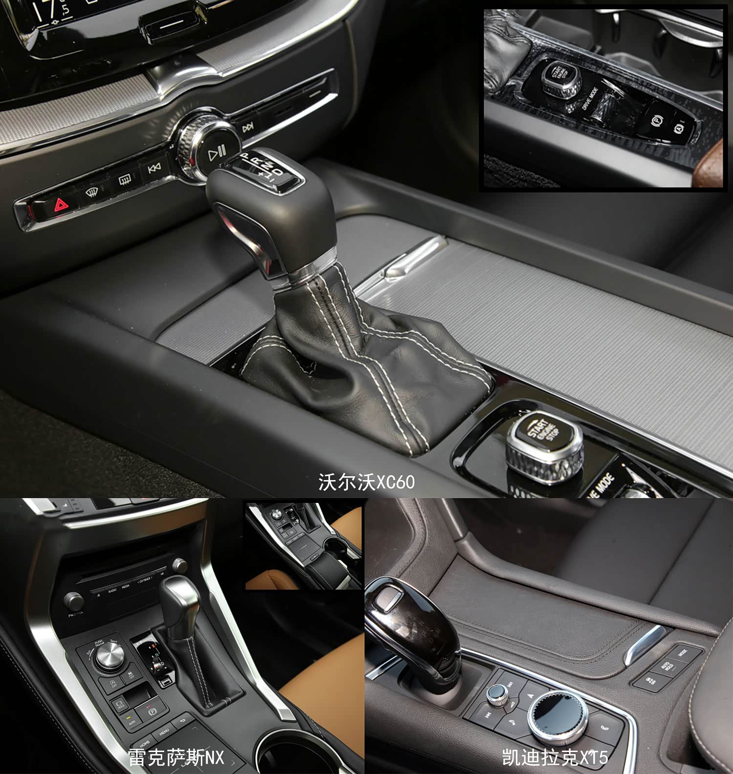 三车的挡杆台布局都不相同,沃尔沃XC60看上去最简洁,雷克萨斯NX最为复杂,凯迪拉克XT5整体中规中矩,但它是唯一采用电子挡杆的,档次感较高。从挡杆周围的功能按键来看,沃尔沃XC60设有驾驶模式滚轮调节、电子手刹及自动驻车按键,其中旋钮式一键启动按键最抢眼;雷克萨斯NX的驾驶模式调节采用旋钮控制,后方设有诸多车辆辅助功能按键,最具亮点的是后方的Remote Touch触控系统,中控屏不支持触控操作,需要通过面板调节;凯迪拉克XT5驾驶模式调节为按键式,仪式感是三者中最弱的,两侧设有自动驻车和车身稳定系统开关,旋钮面板为多媒体控制。