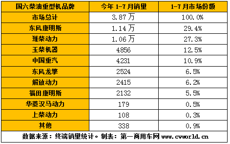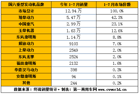 今年1-7月国六柴油重卡发动机销量排行(单位:台)
