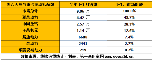分企业来看,潍柴天然气发动机以4.42万台的销量和48.7%的份额,占据了市场的近半壁江山。不过,虽然一直领先,但潍柴燃气机的份额有所下降,比其去年同期在燃气机市场的份额要低一些。玉柴1-7月累计销售燃气重卡发动机1.14万台,成功破万,市场份额也达到12.6%。潍柴和玉柴这两家企业都是属于独立发动机供应商,同时向市场上的多家整车企业供应发动机,跟排行榜上的其他四家动力企业不太一样。